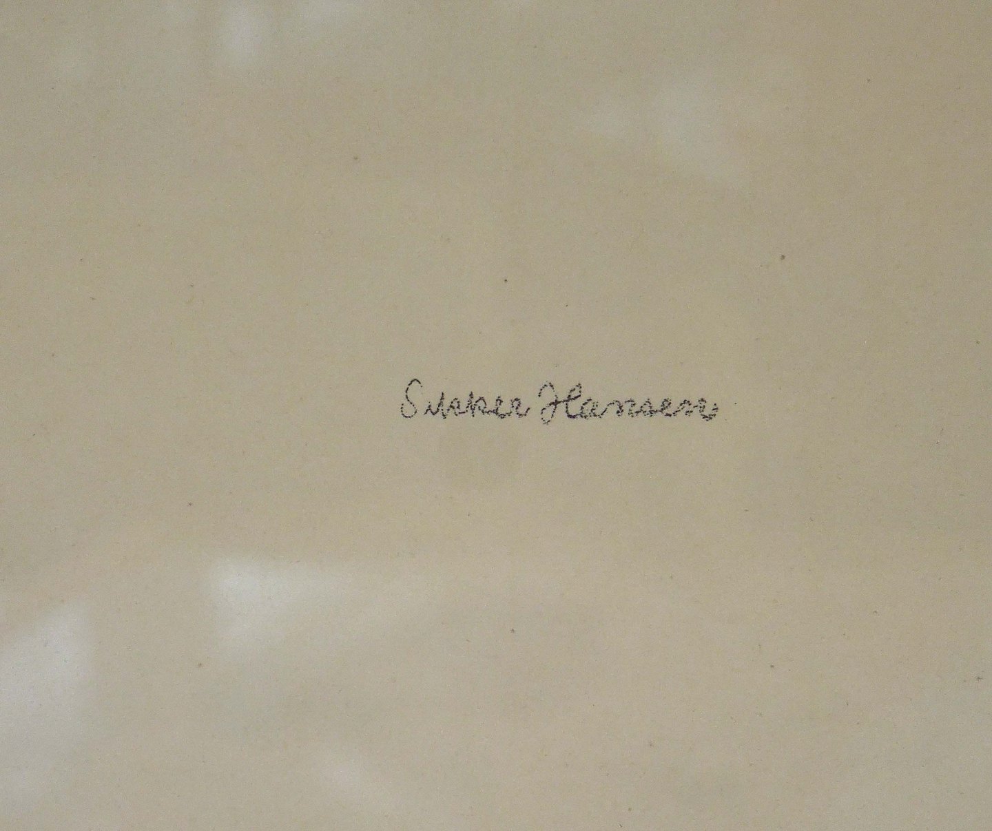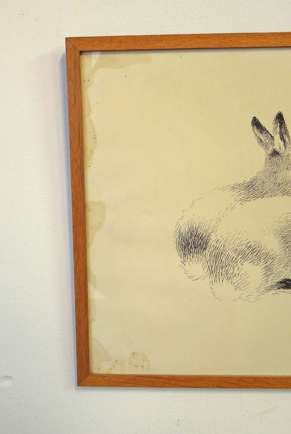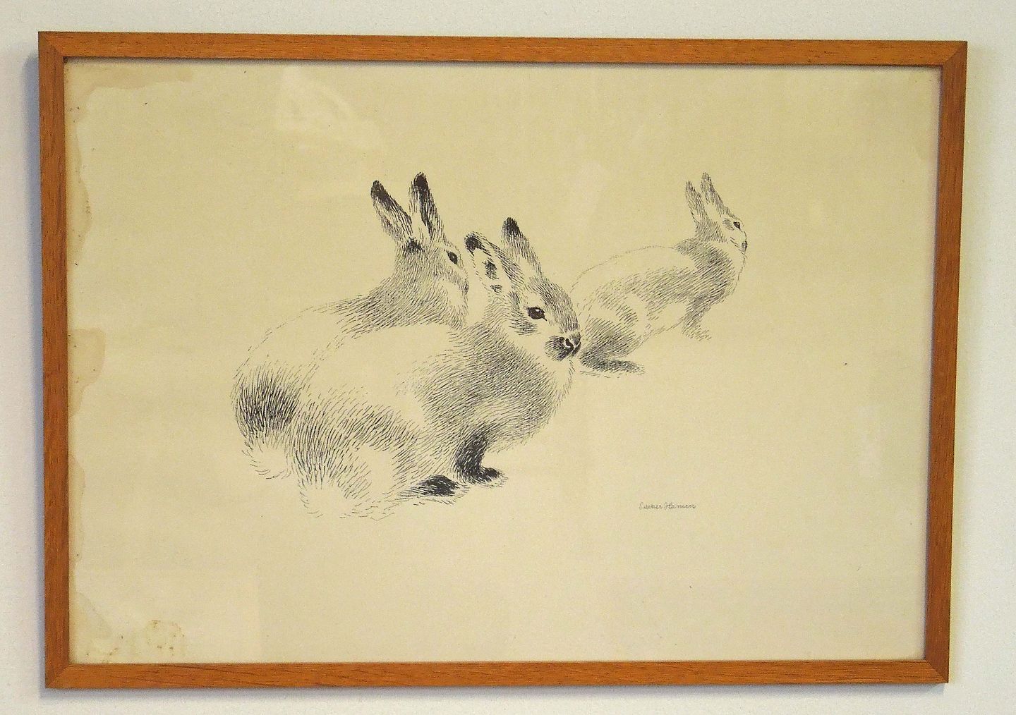 Indrammet tryk af Sikker Hansen med motiv af tre kaniner.
