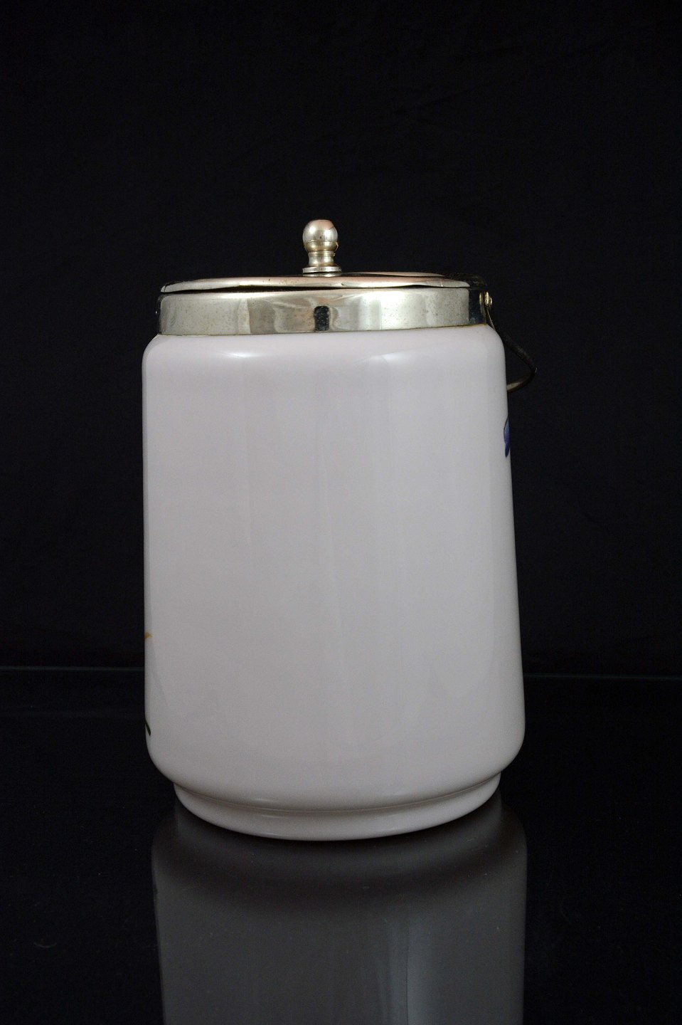 Glas kagekrukke med blå blomst. Krukken er lavet i hvidt glas og låget er fremstillet i sølvbelagt metal.
