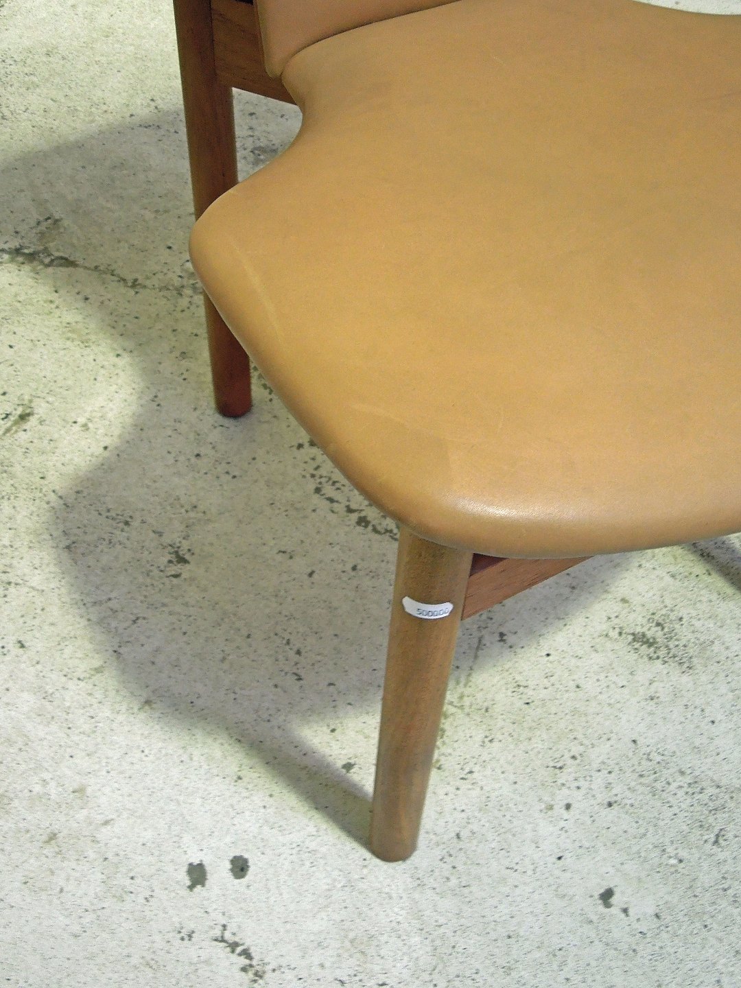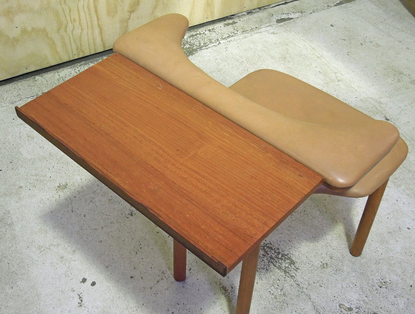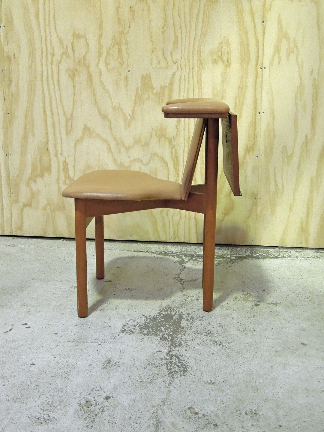 Frederik den syvende stol designet af Hans Olsen. Stolens ryg og sæde er betrukket med beige læder. Bag på Frederik 7 stolen er der en mindre klap-op skriveplade. Stolens stel og skriveplade er fremstillet teak.