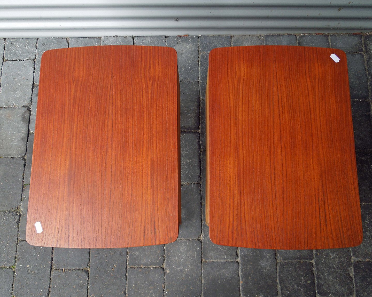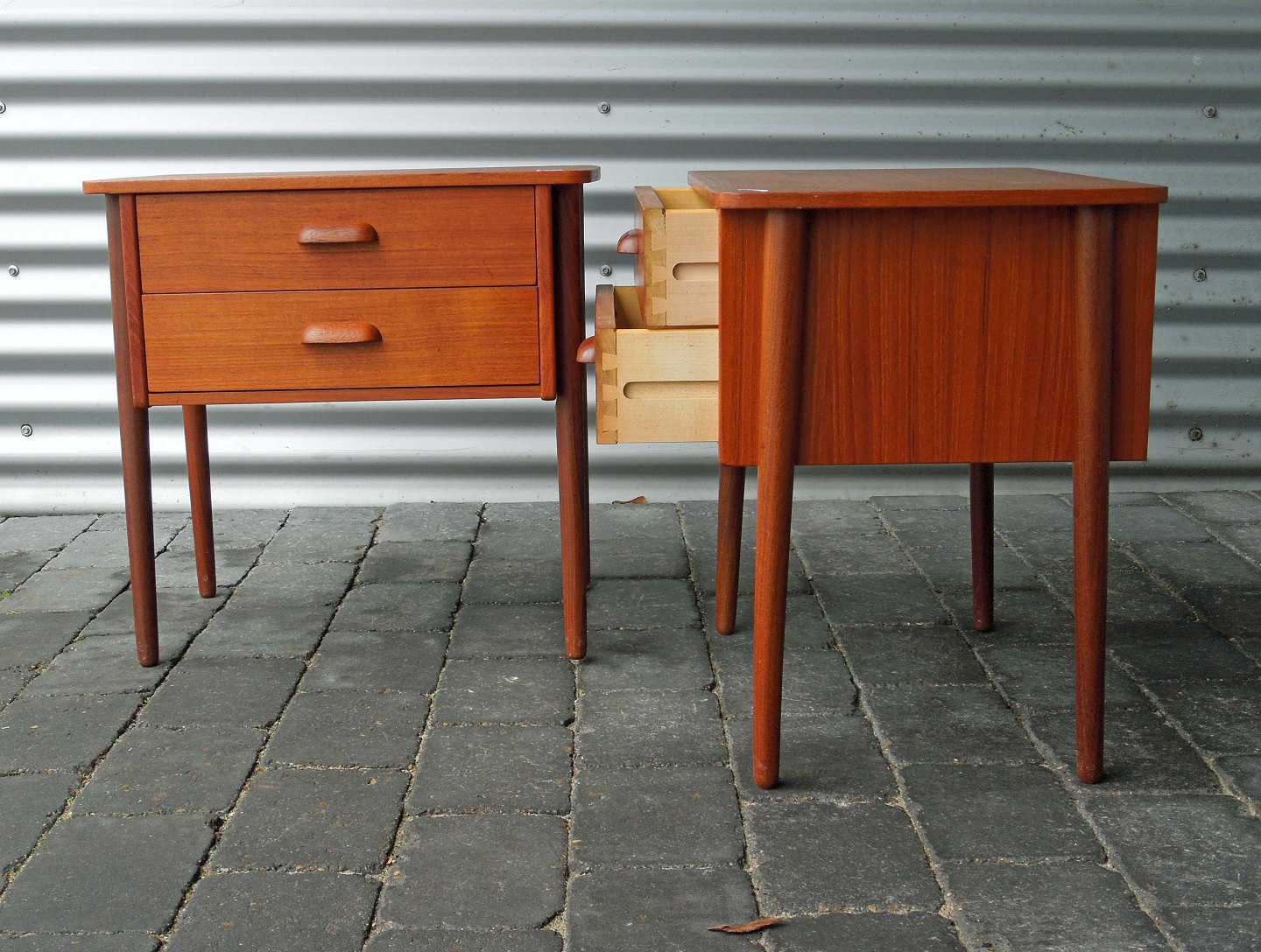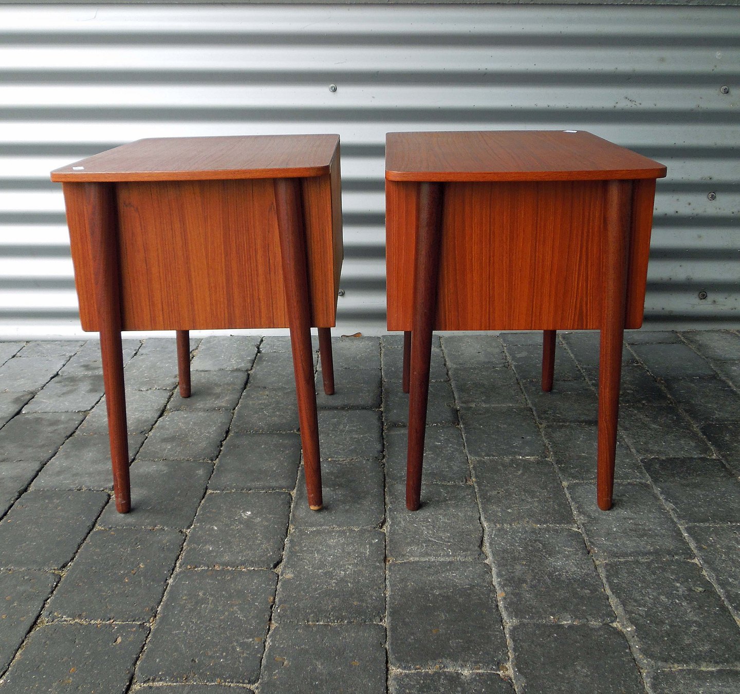 Sæt sengeborde i teak. Fremstår med aldersvarende brugsspor på topplade og få ridser på benene.