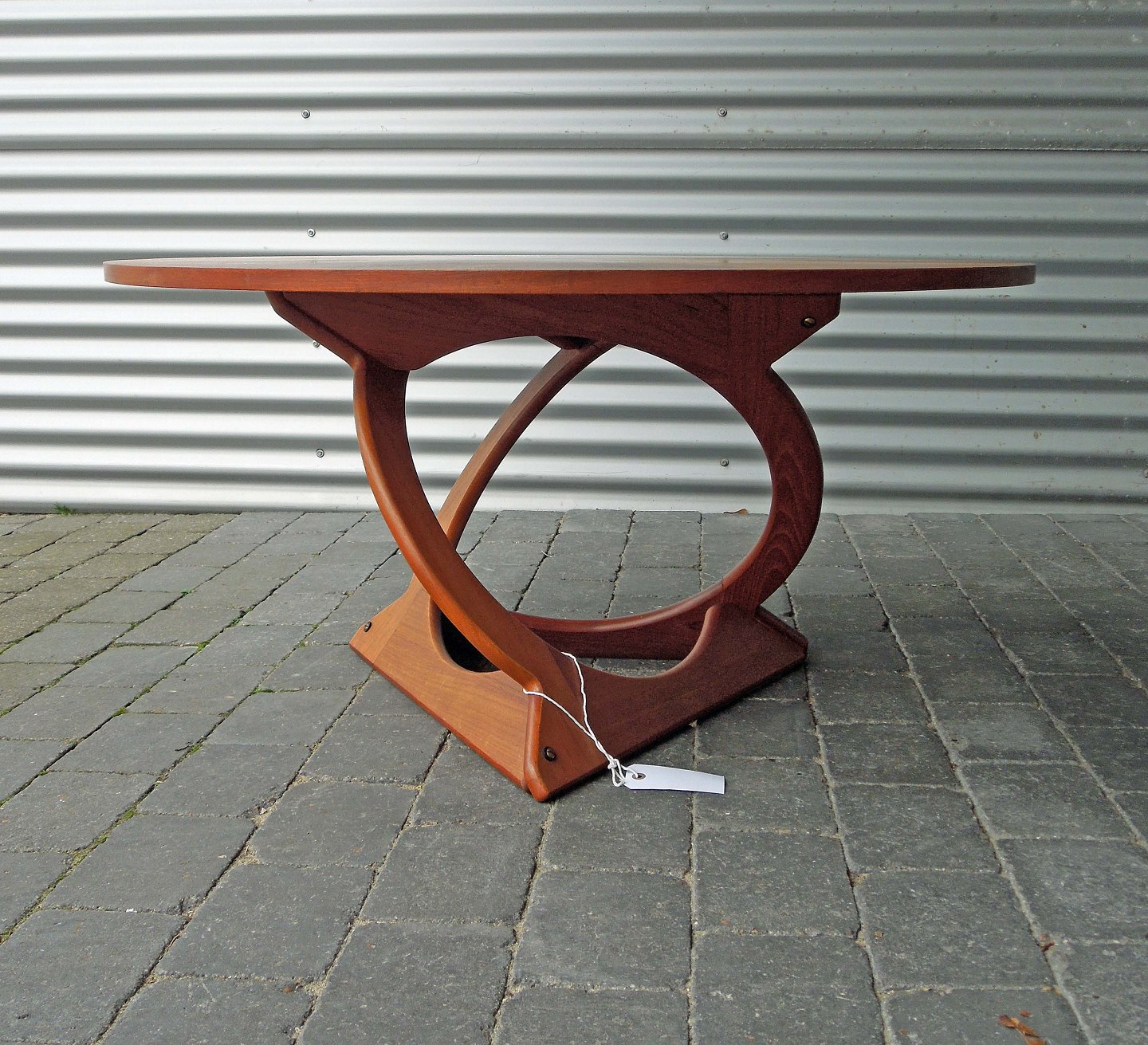 Rundt sofabord i spejlskåret teak. Designet af Søren Georg Jensen for Cubus. Prod. Tønder Møbelfabrik.