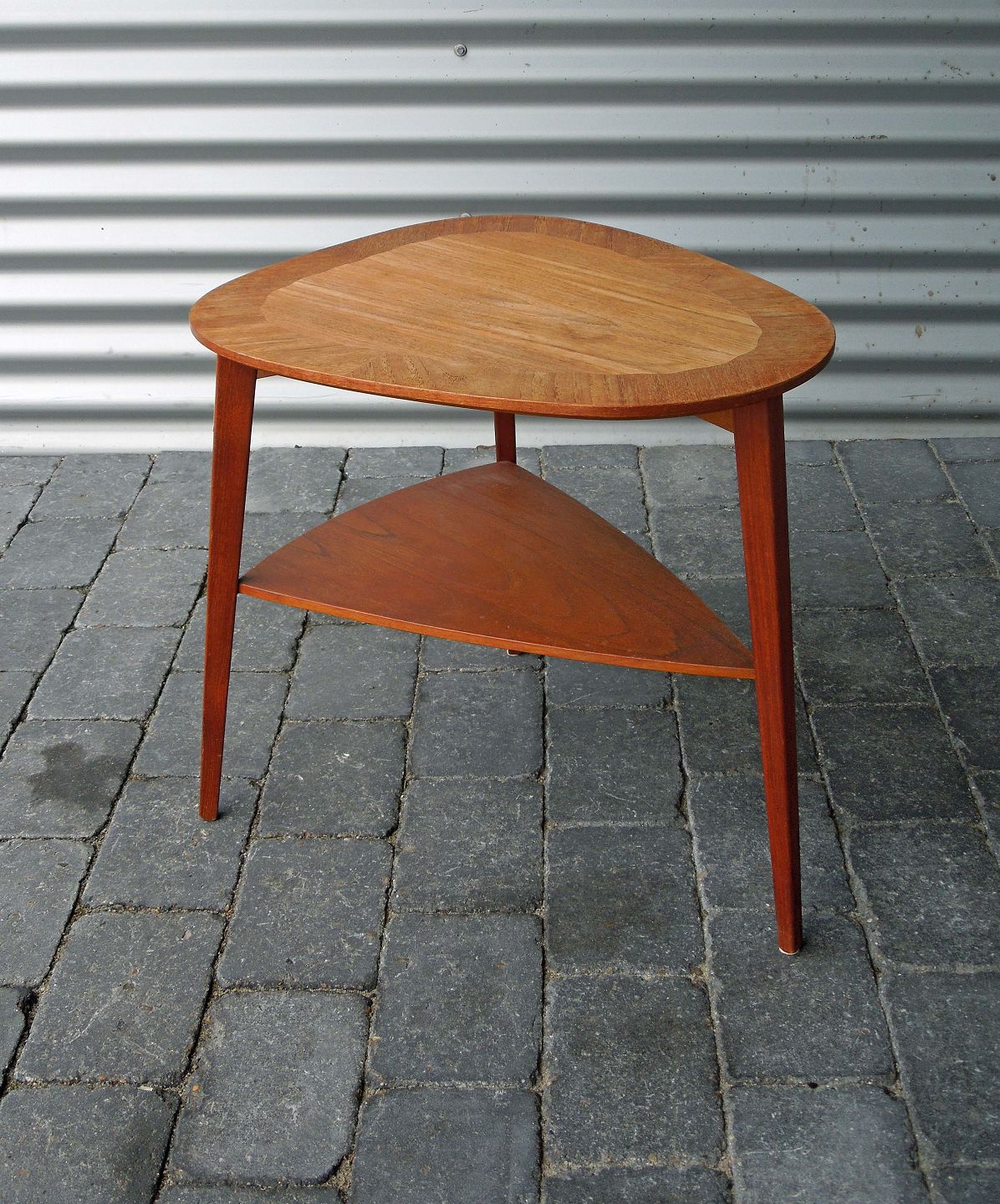 Lille ovalt sidebord med hylde. Bordet er i teaktræ og fremstår med lettere brugsspor.