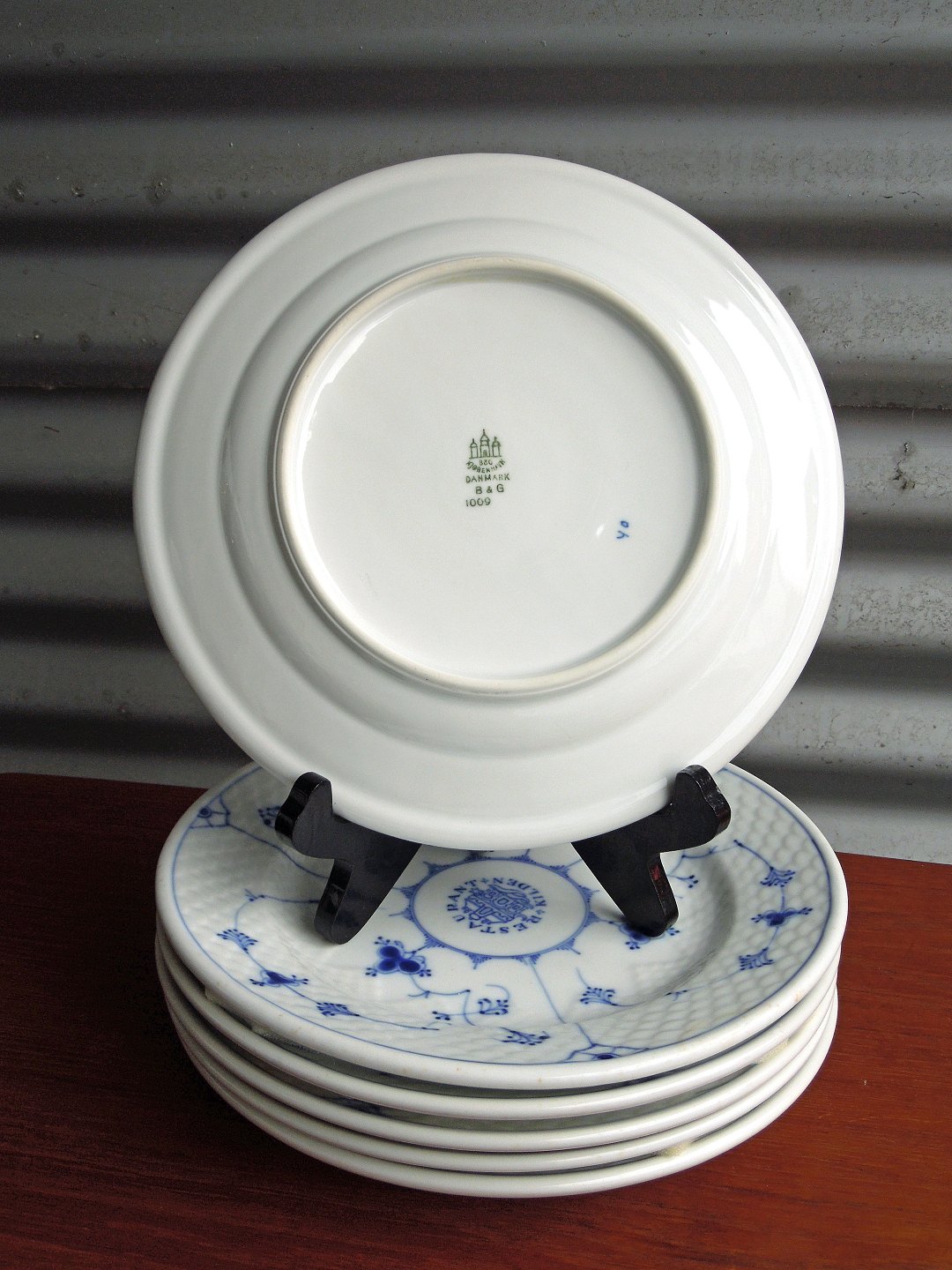 3 middagstallerkner (nr. 1009) i blåmalet hotelporcelæn fra Bing og Grøndahl, Danmark. Tallerknerne er fra "Restaurant Kilden" - det nuværende Hotel det hvide hus og fremstillet i kraftigt porcelæn / jernporcelæn. Lettere brugsspor kan forekomme.