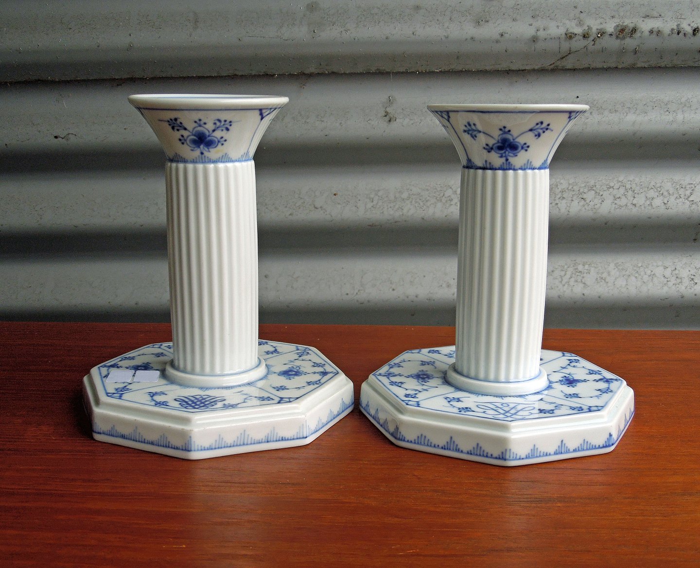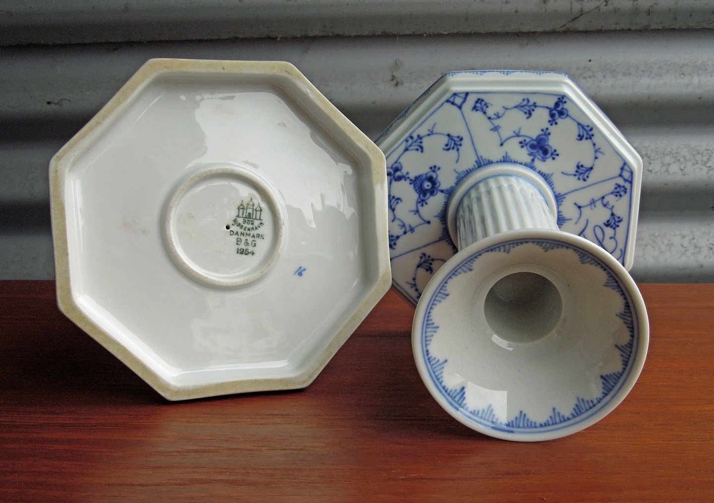 Blåmalet Kong Frederik Lysestager (nr. 1254) i hotelporcelæn fra Bing og Grøndahl. Den ene stage har en mindre reparation i lyseholderen.