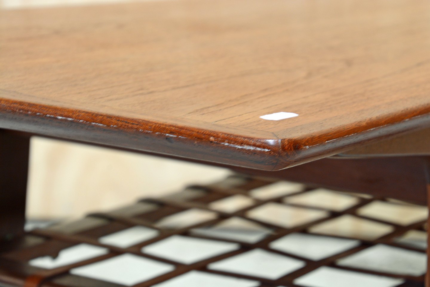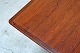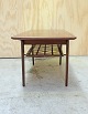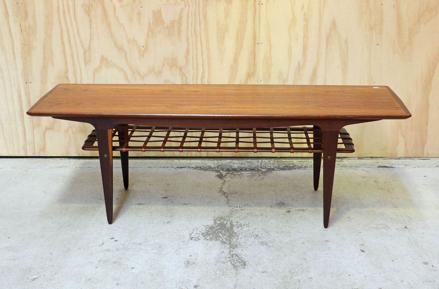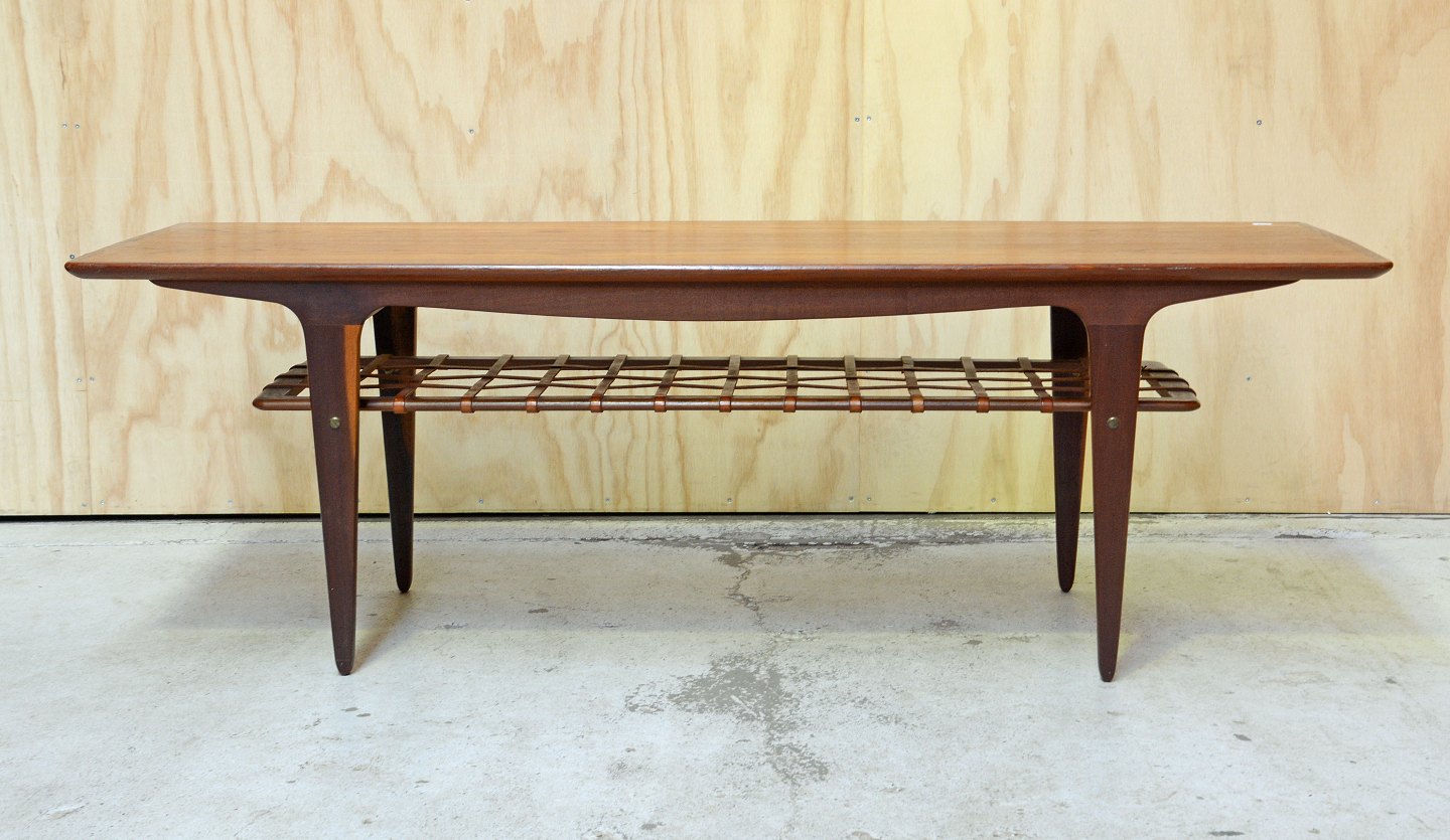 Sofabord i teaktræ med hylde af remme i kernelæder. Bordet fremstår med enkelte brugsspor.