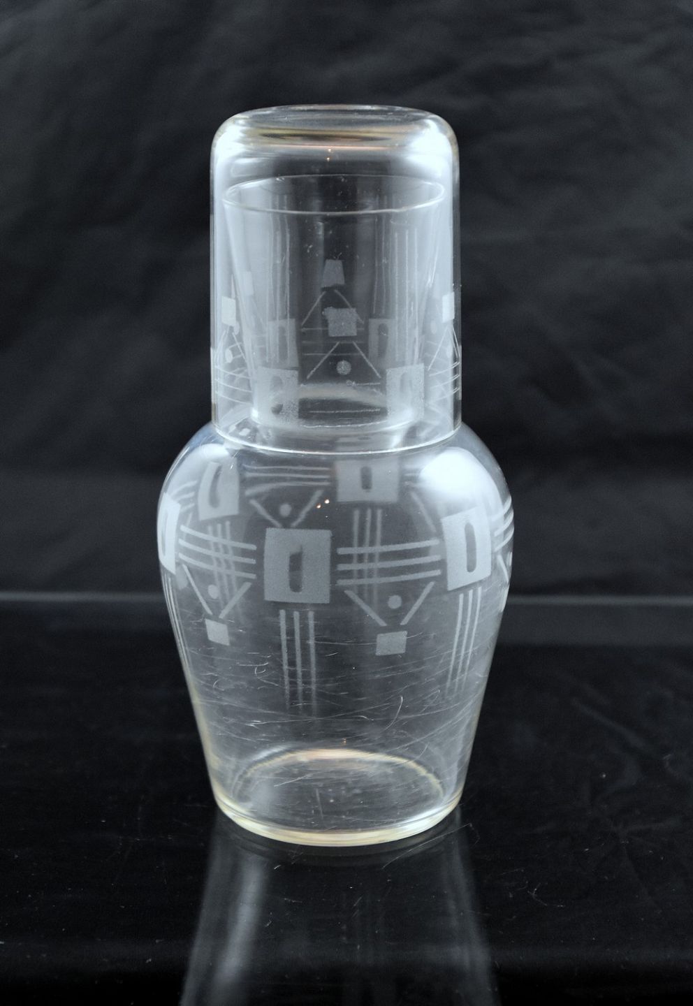 Natbordskaraffel med drikkeglas, klart glas med slibninger. Ca. år 1910