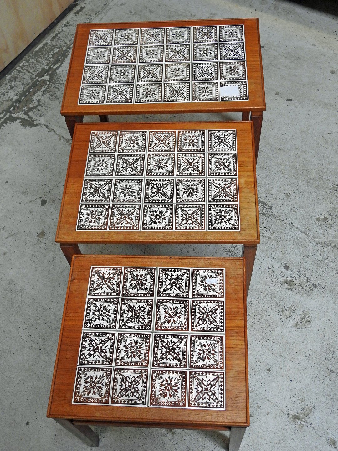 Indskudsborde i teaktræ med kakler. Dansk møbeldesign. Tre borde med mønstrede kakler i farverne hvid og brun. Brugsspor på topfladen.