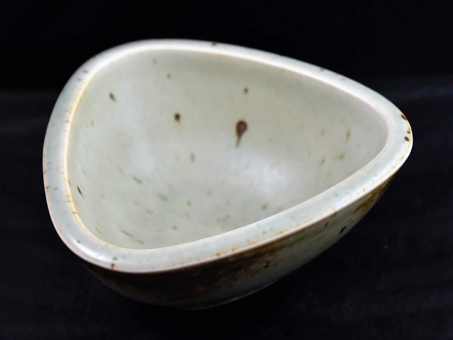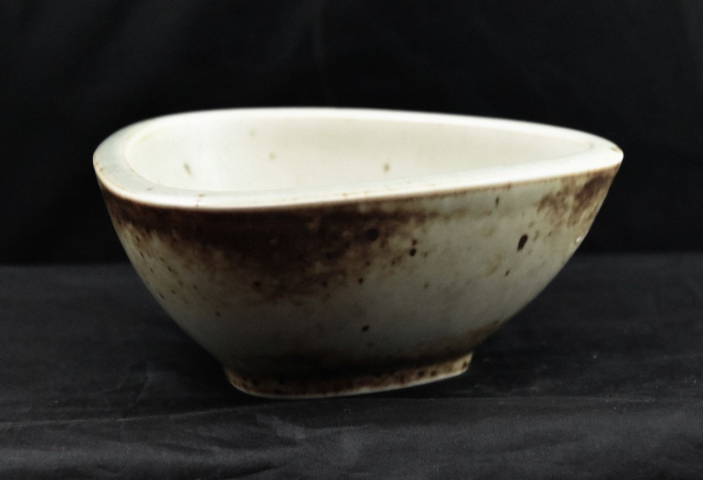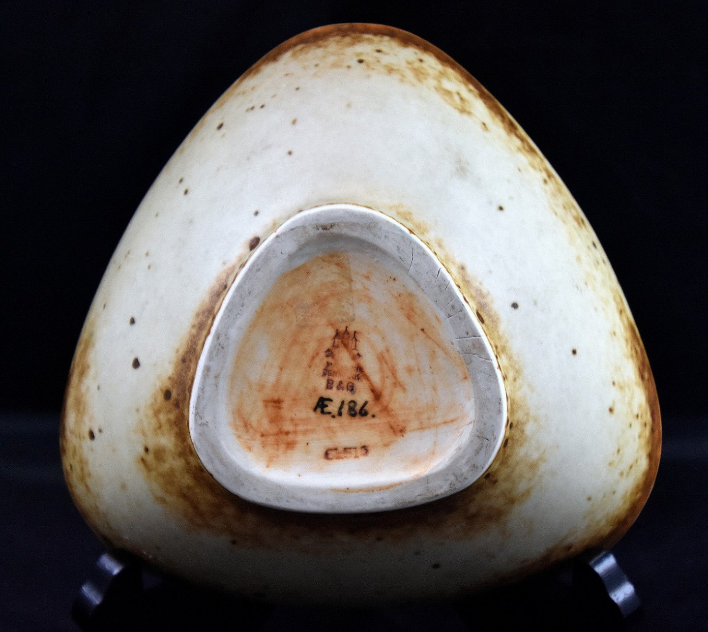 Bing & Grøndahl, 3-kantet keramik skål (Æ 186) med brunlig glassur og brune nister i glassuren indvendig