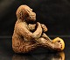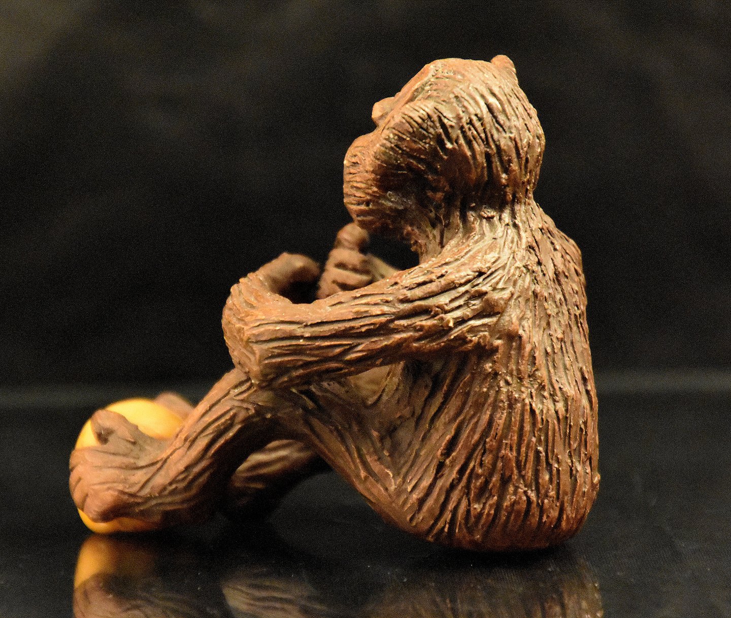 Siddende abe med gul bold mellem fødderne