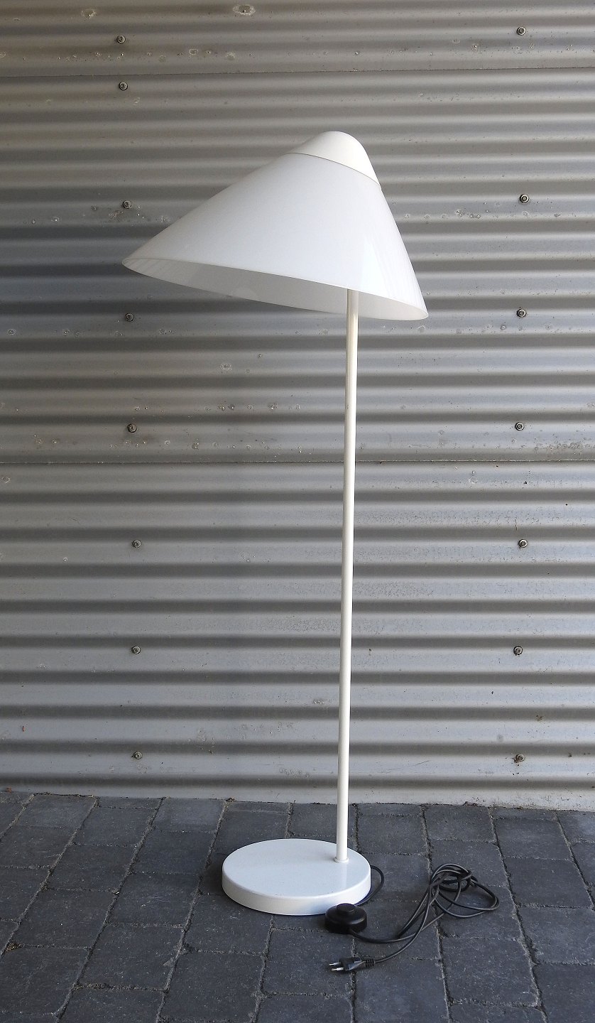 Opala Standerlampe med oval skærm designet af Hans J. Wegner. Skærmen er i opalhvid plast på hvidlakeret metalfod. Fremstår med enkelte brugsspor på fod.