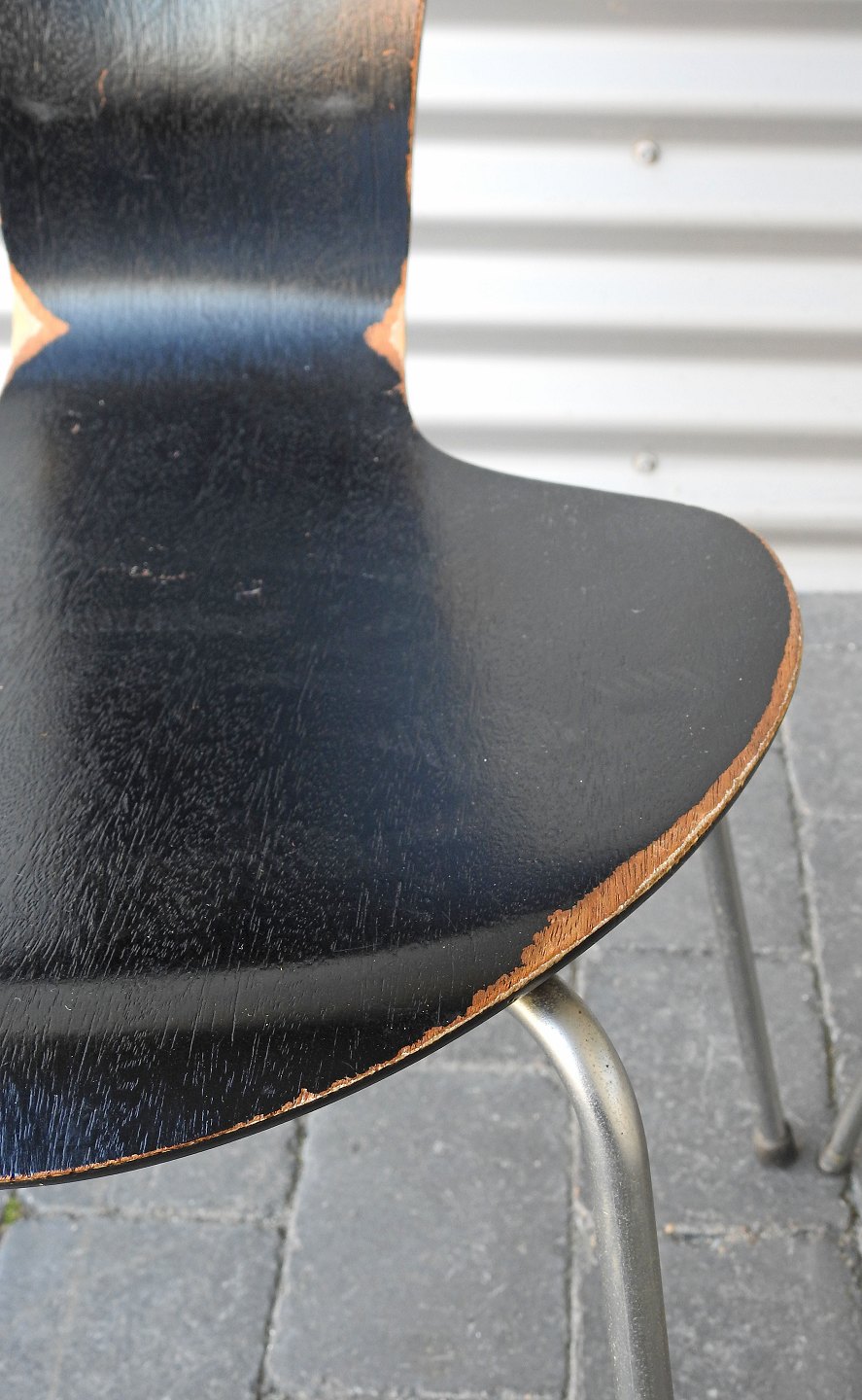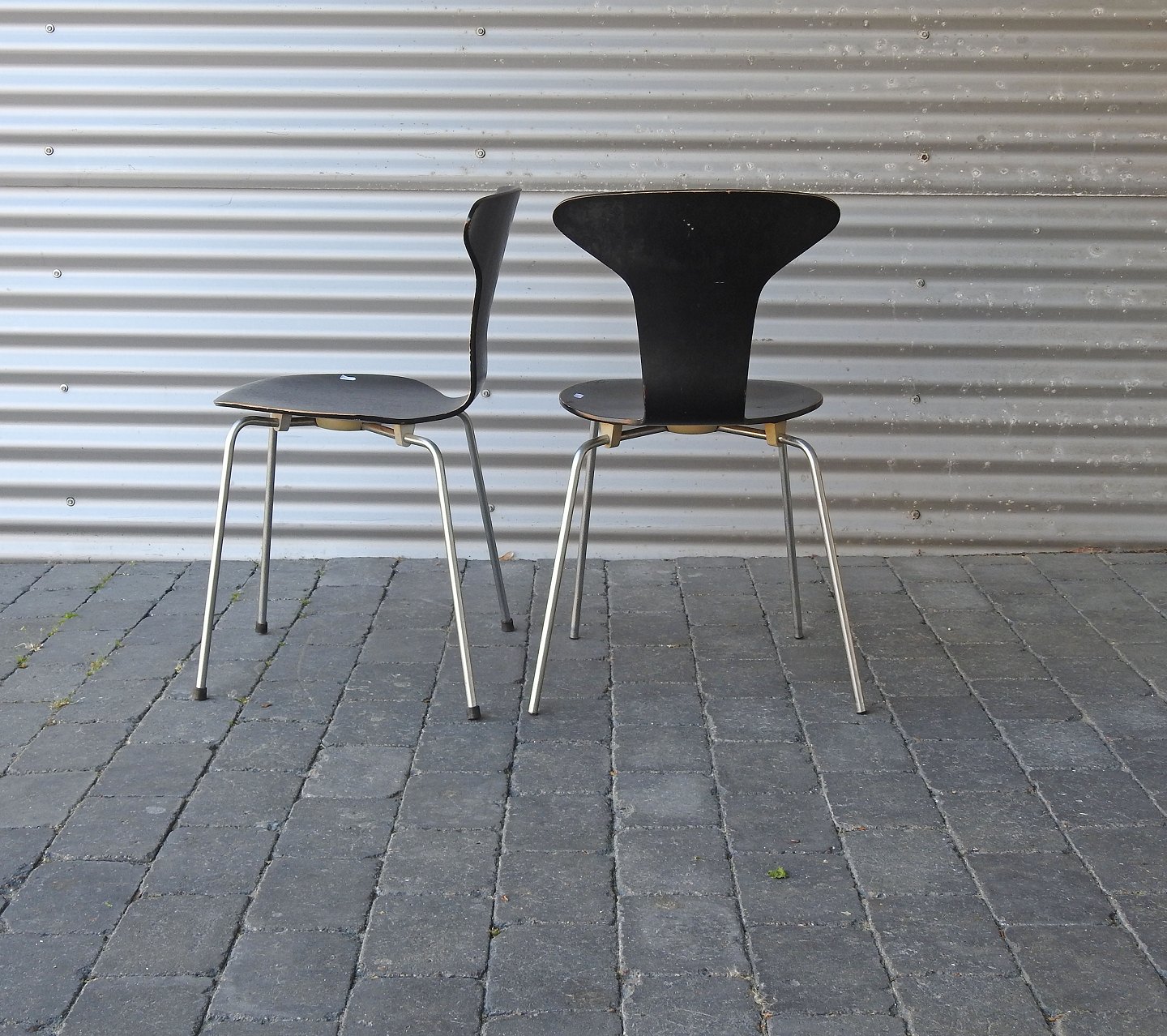 To mygge-stole designet af Arne Jacobsen. Fremstår med brugsspor på sædet, se billede. Model 3105
