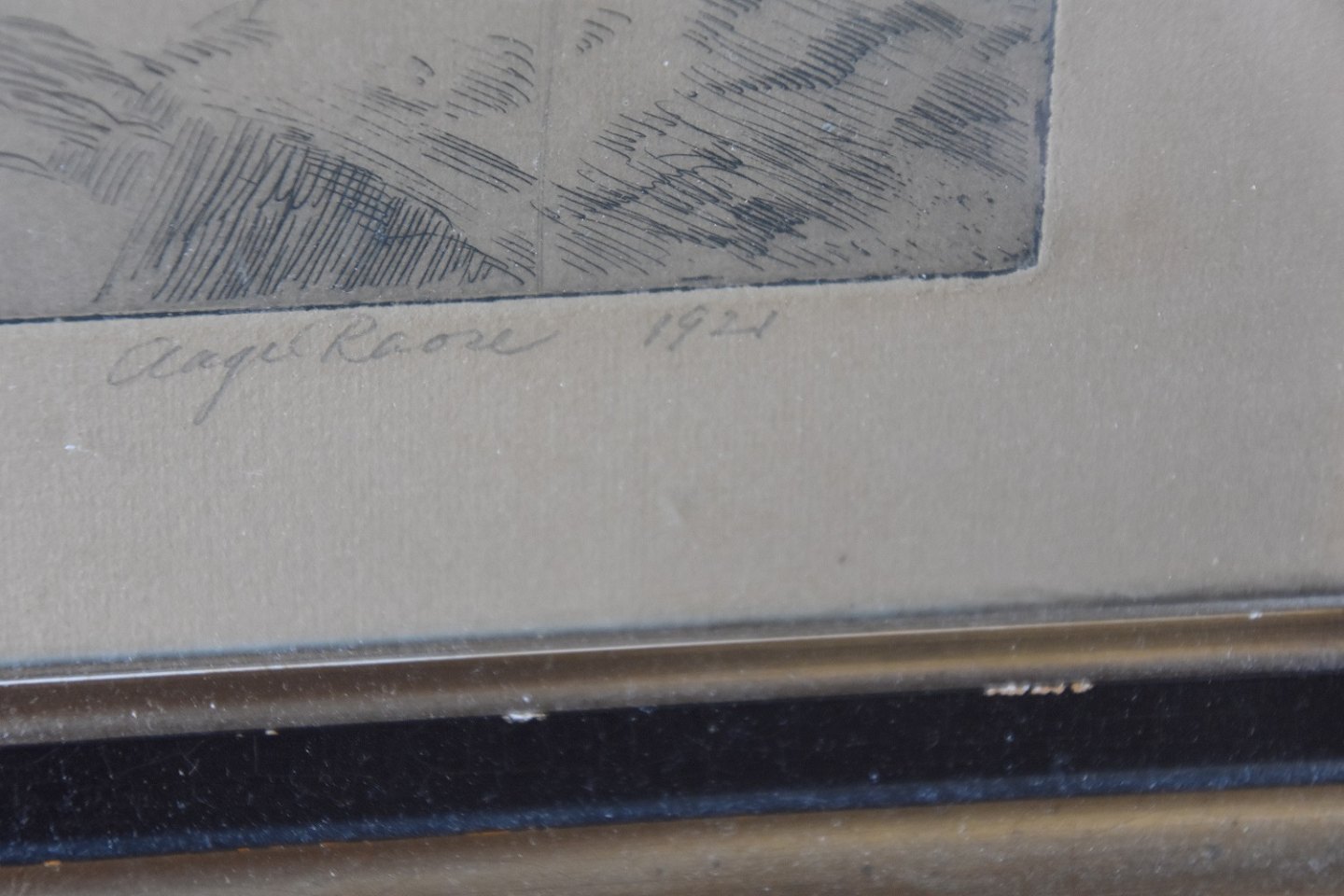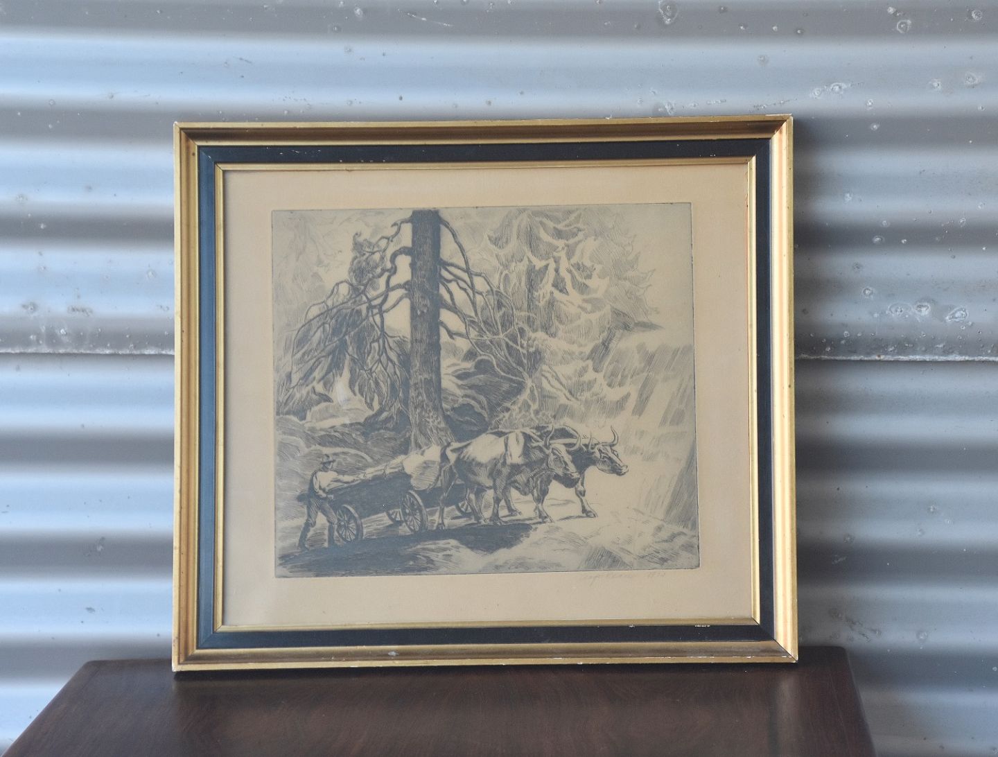 Radering af Aage Roose, med motiv af Bonde med kreaturer.