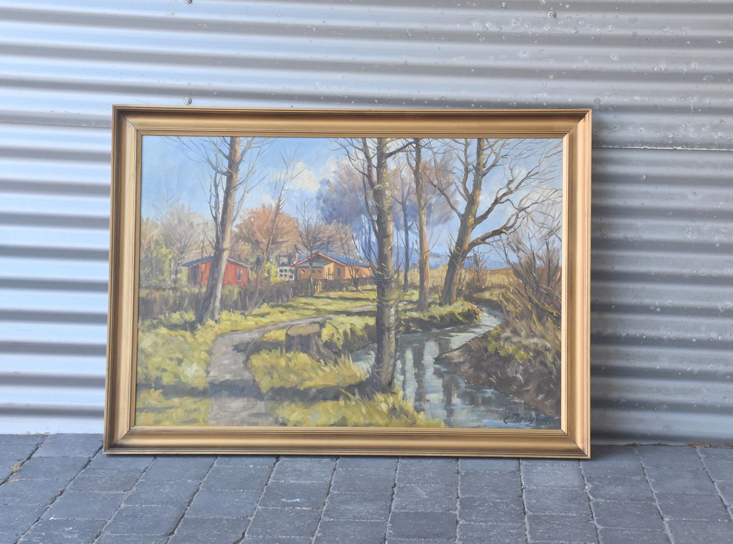 Maleri af hus mellem træer af Evelyn Thorbjørn.