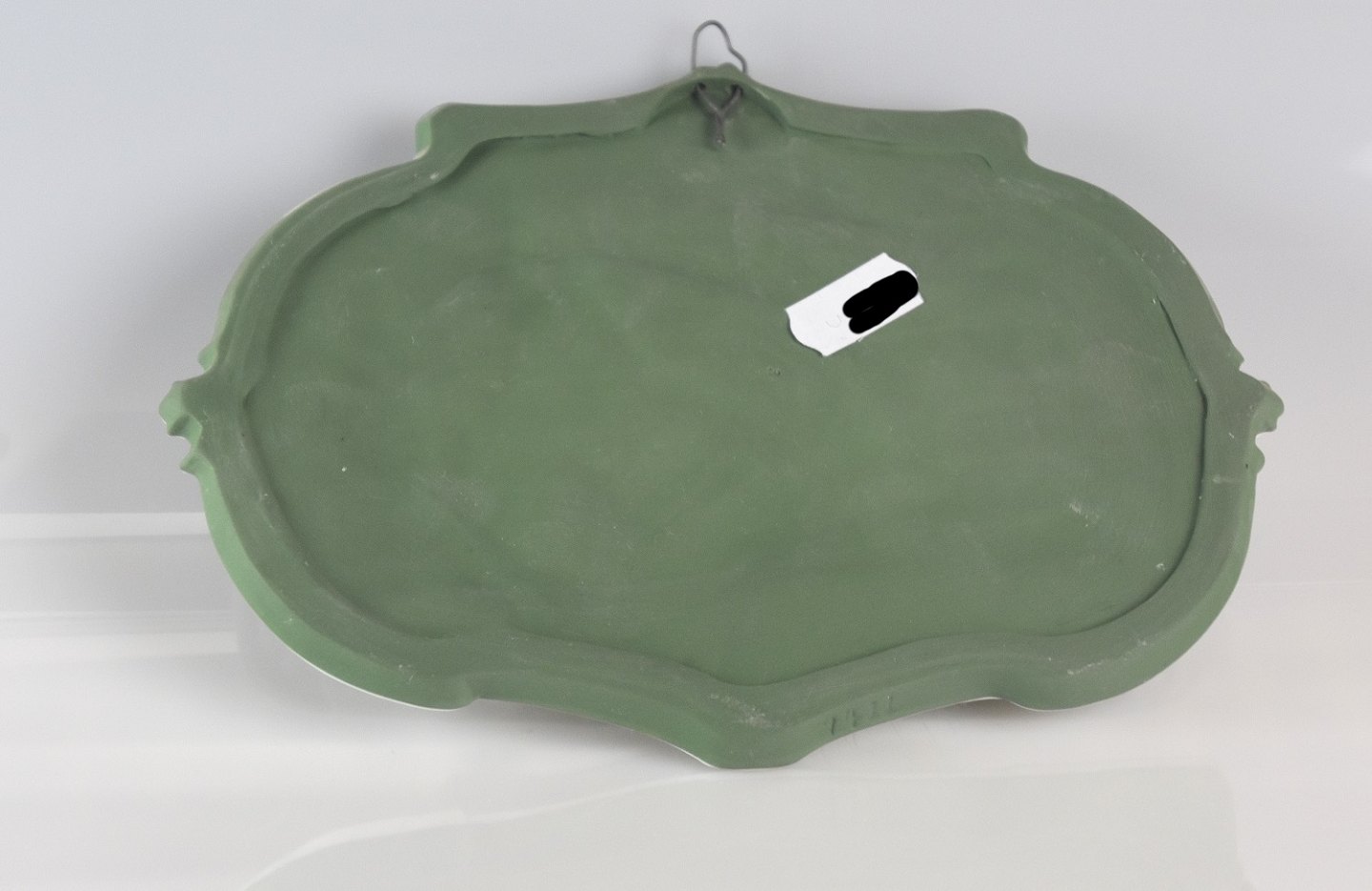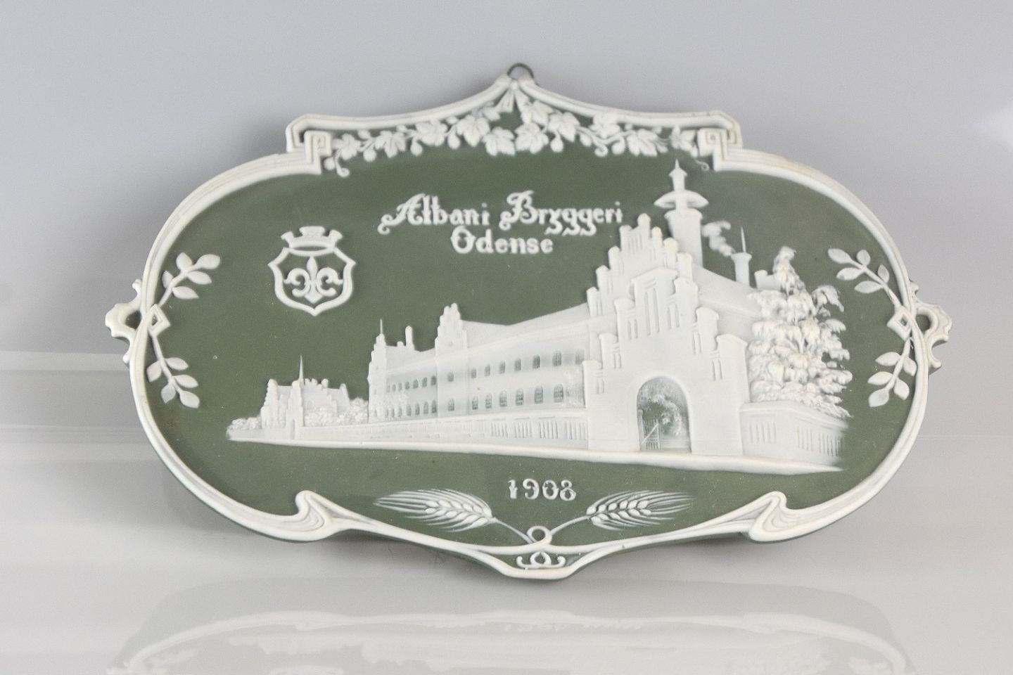 Biskuit platte/relief, fremstillet af Wedgwood jasperware, som er uglasseret porcelæn også kaldet biskuit, grønt men hvidt motiv