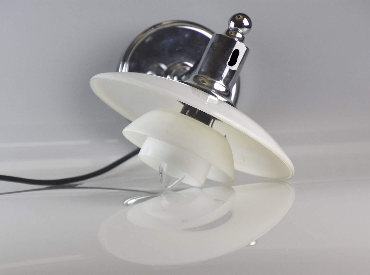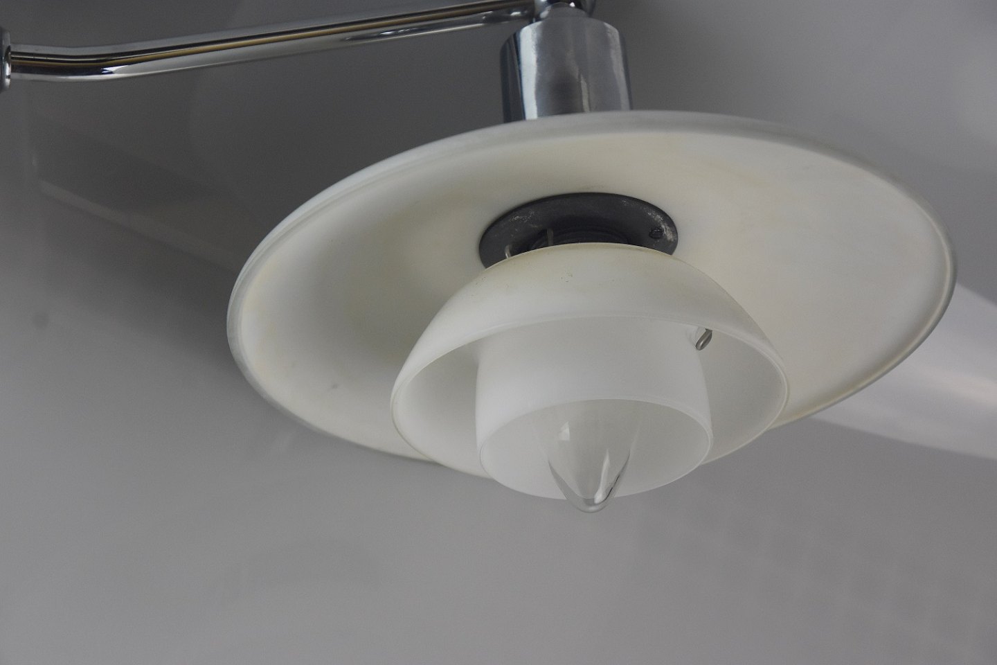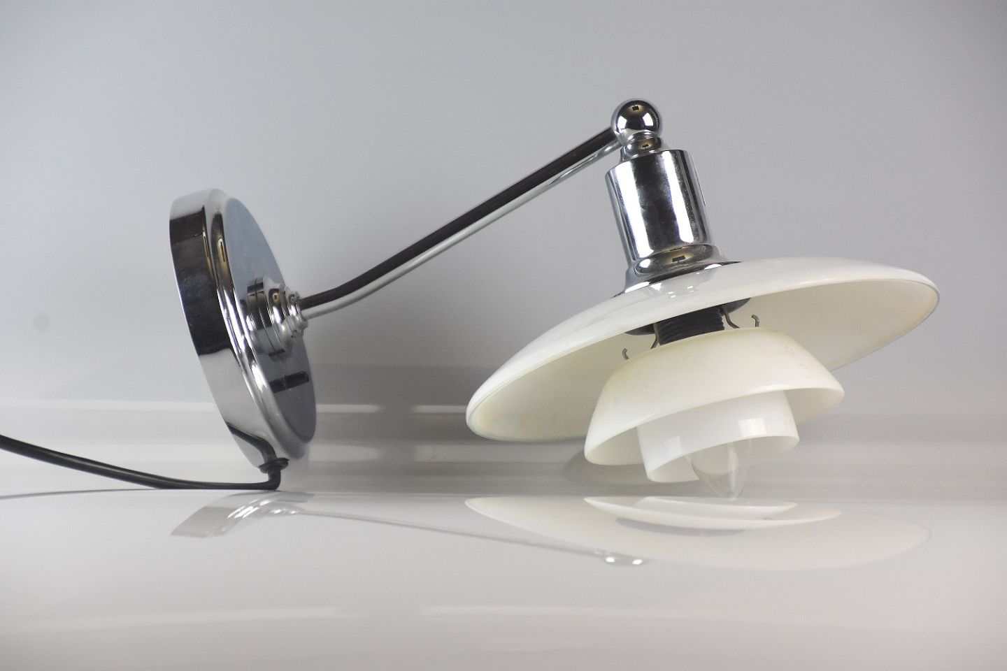 Væglampe PH 4, fremstillet hos Louise Poulsen og designet af Poul Henningsen. Lampen er fremstillet af opal glas og armen er af stål
