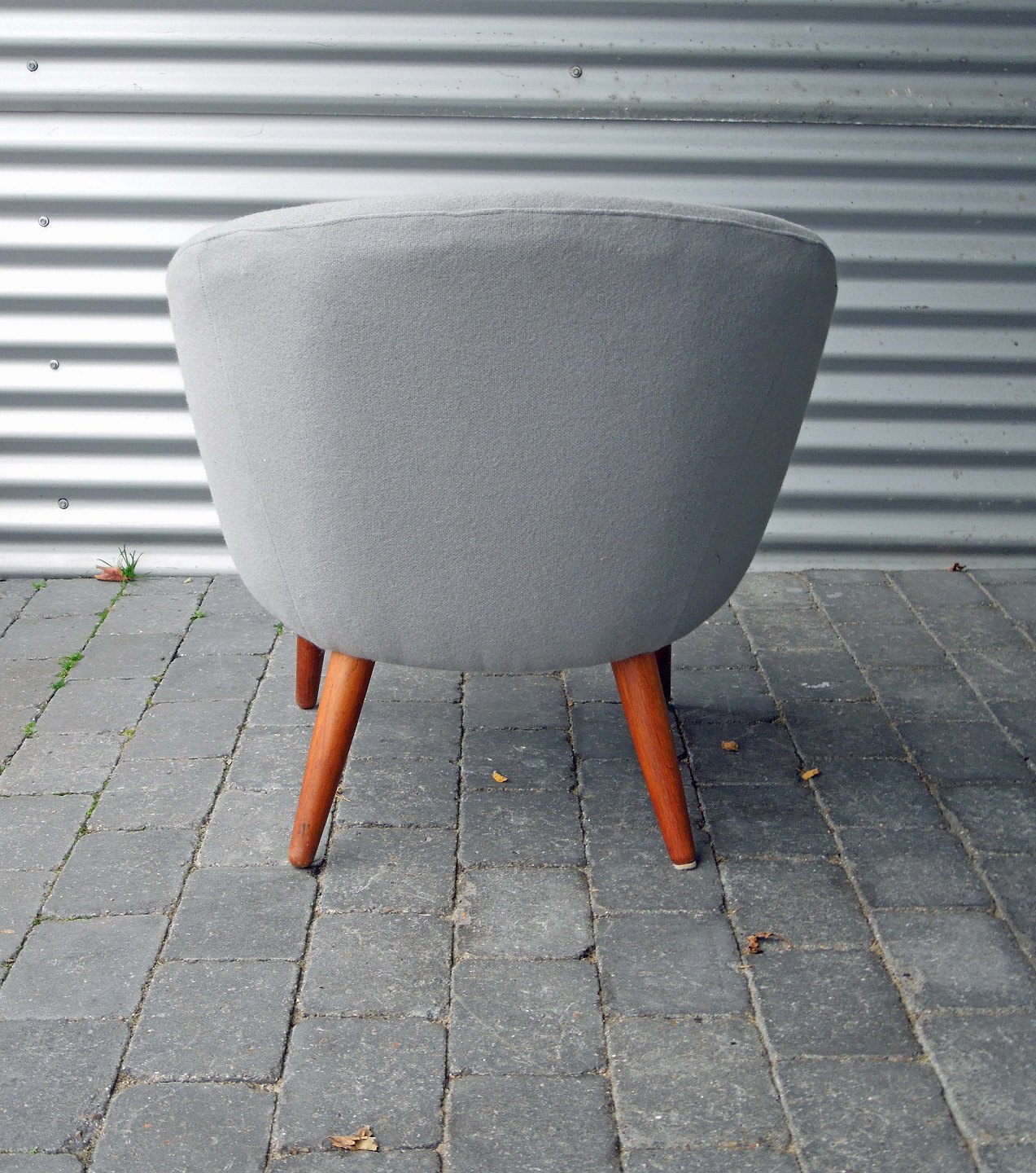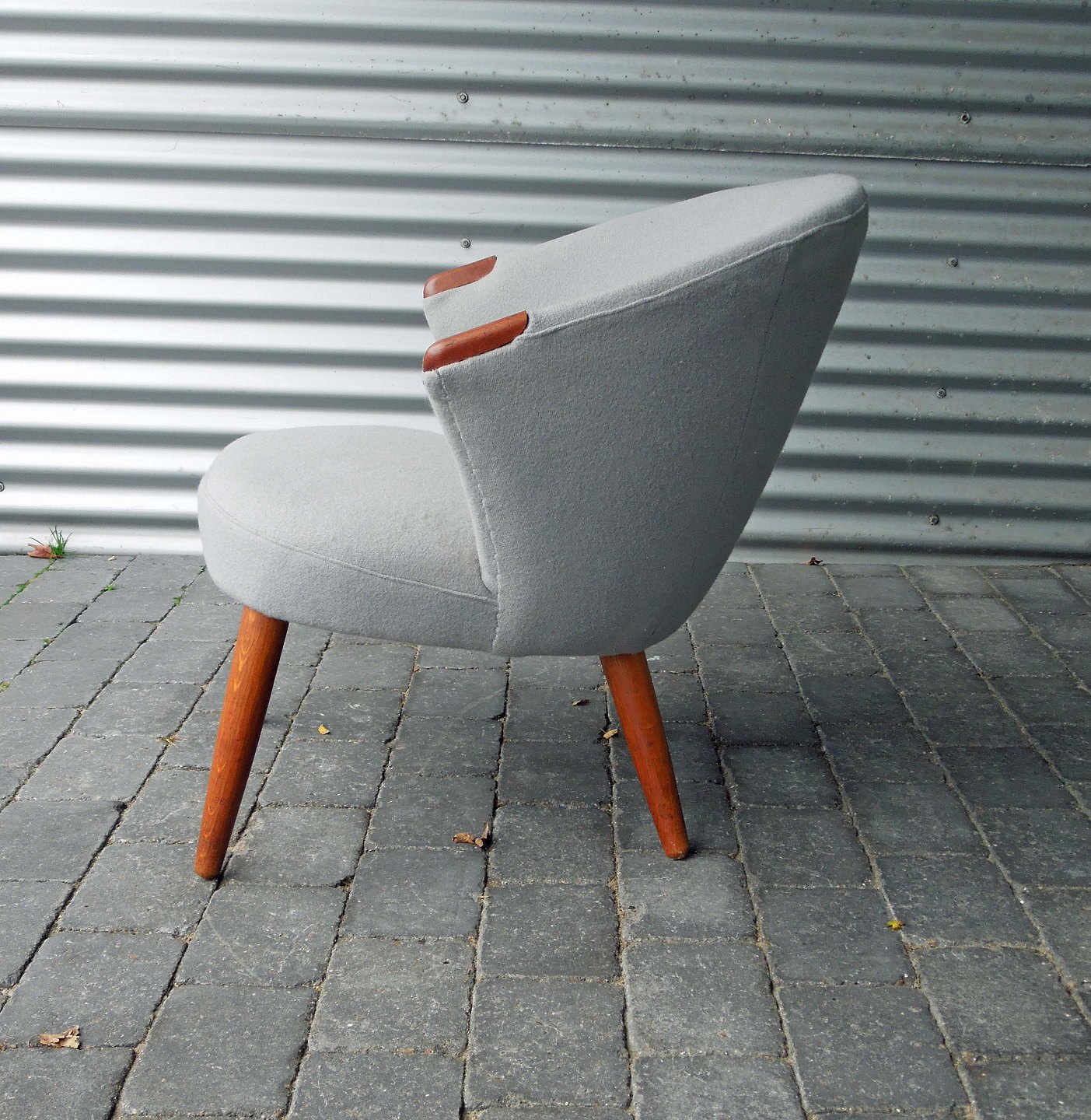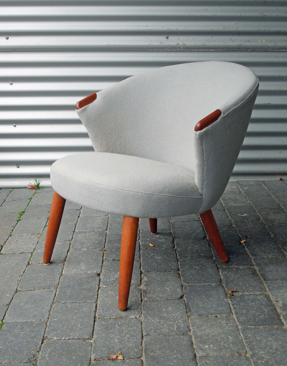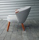 Lænestol, designet af Bent Møller Jepsen, gråligt stof med teak arme og teak ben.