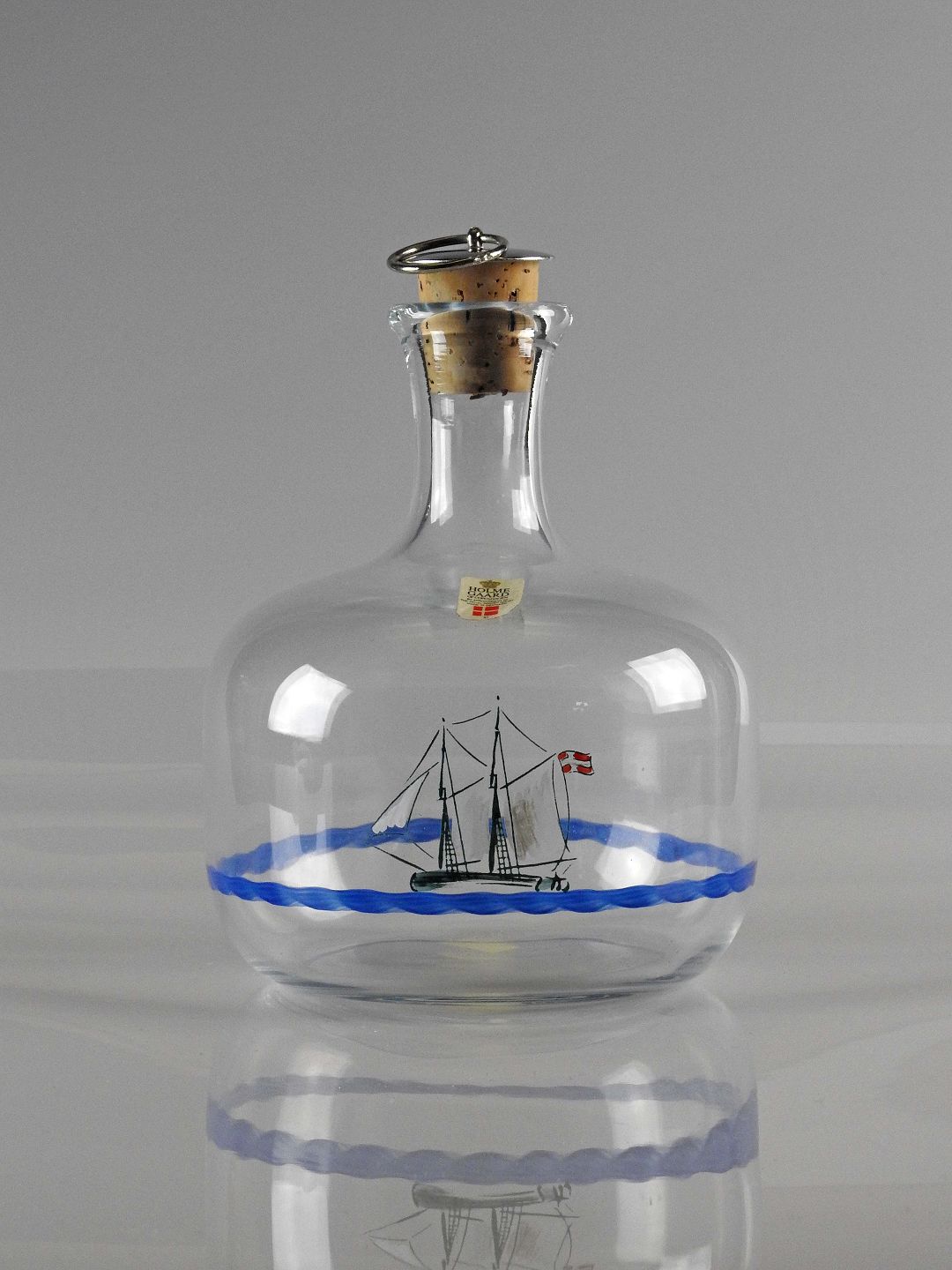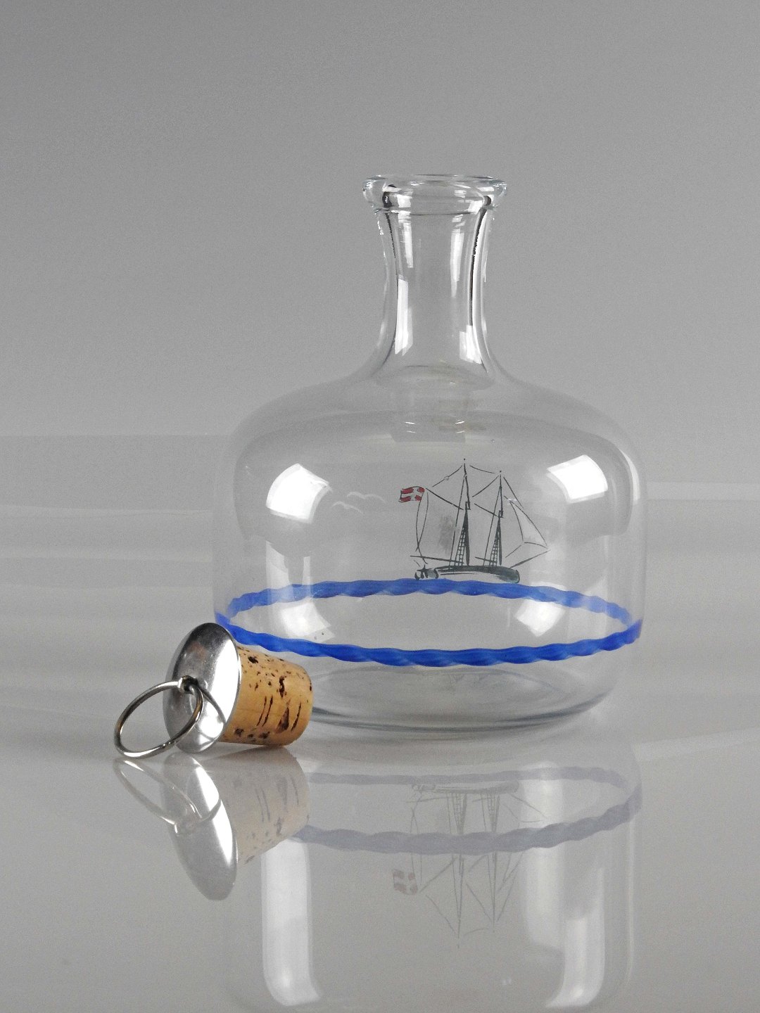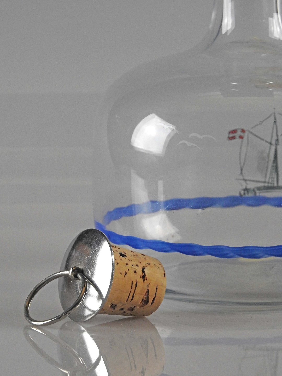 Glasflasken har dekoration af skib og måger. Flasken kommer med korkprop.