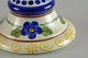 Et sæt lysestager i kunstfajance med motiv af blå blomster og gult mønster på fod.