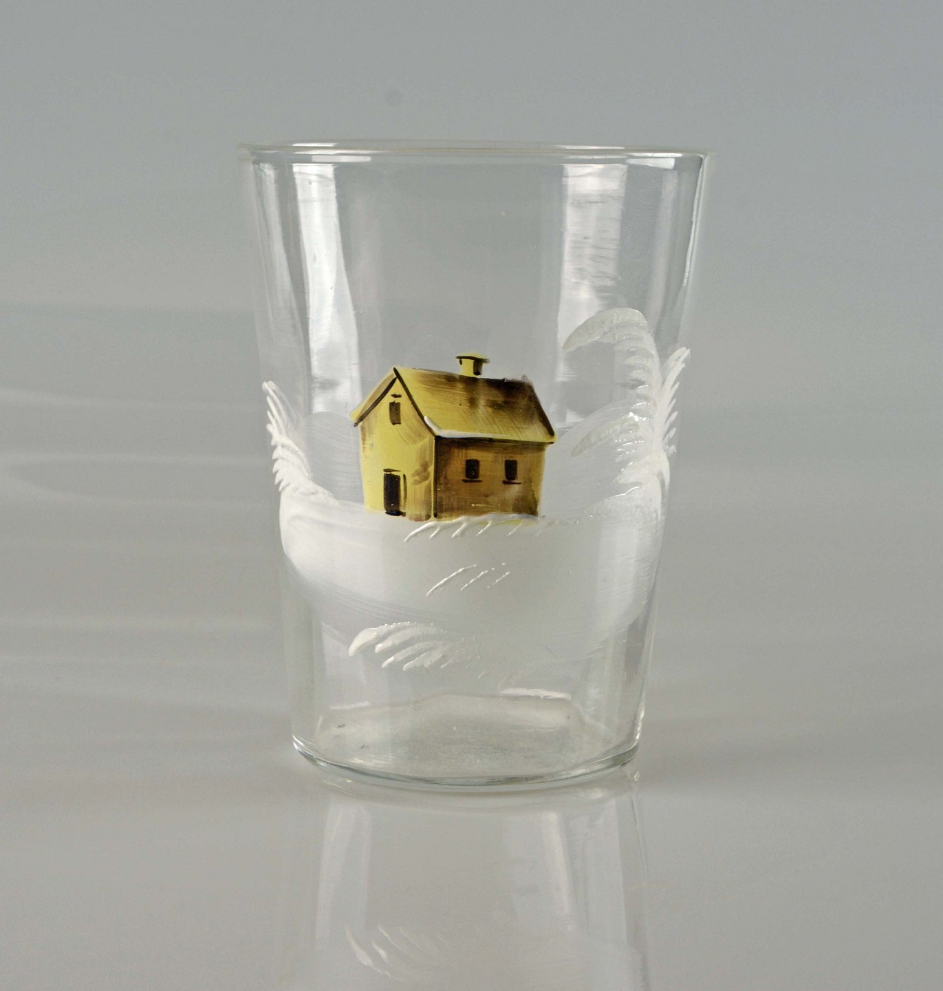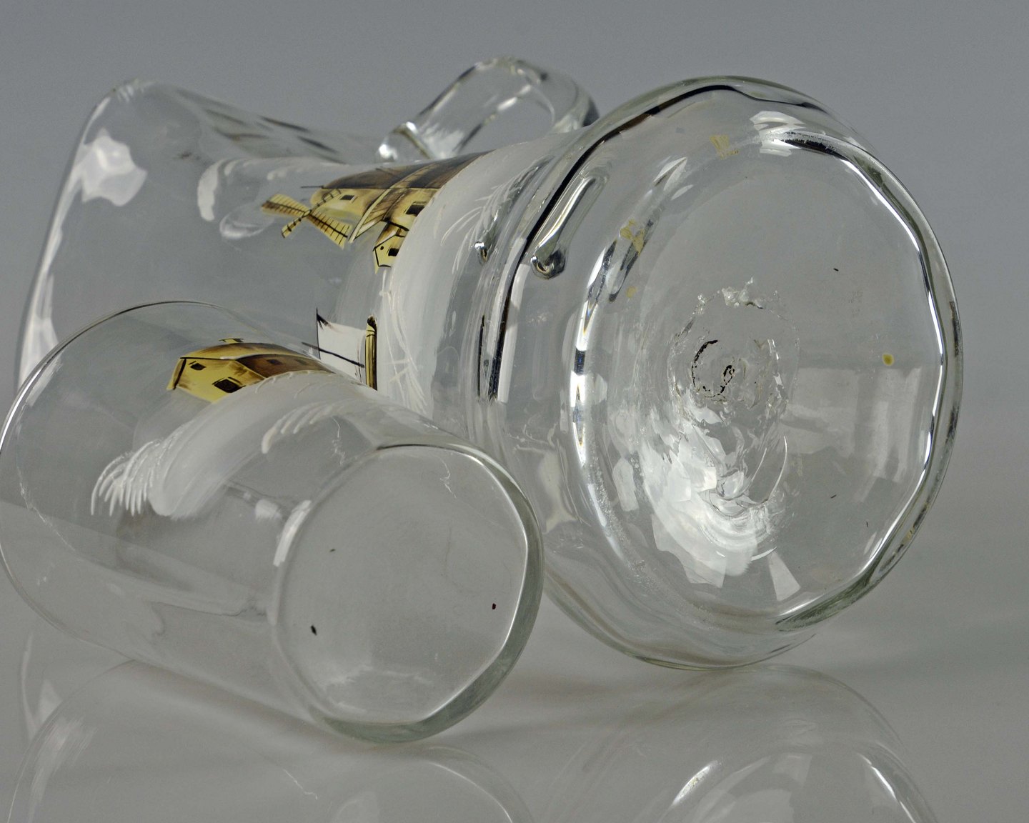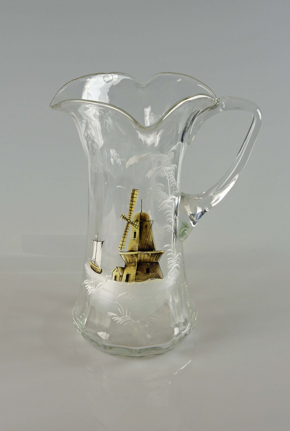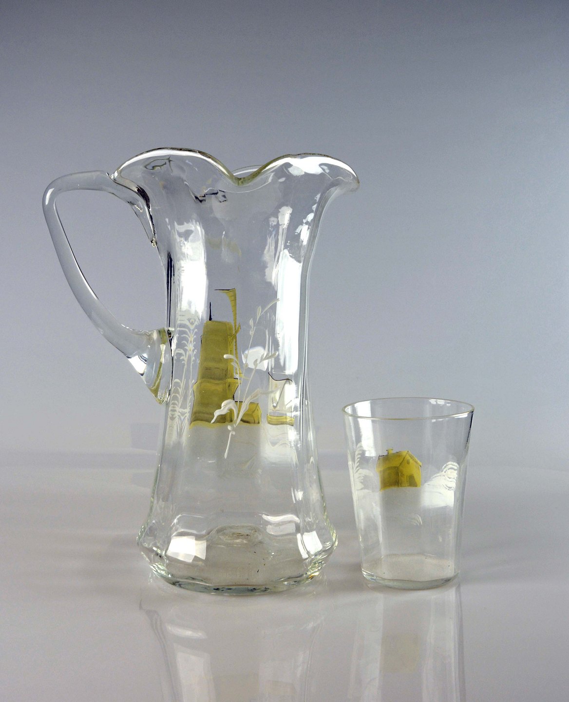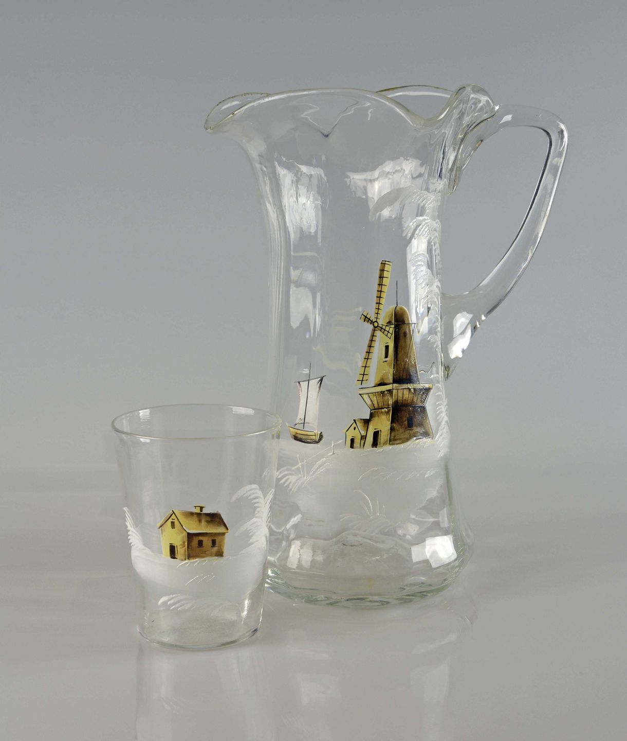 Antik natbordkande og drikkeglas med malet motiv af mølle, båd og hus.
