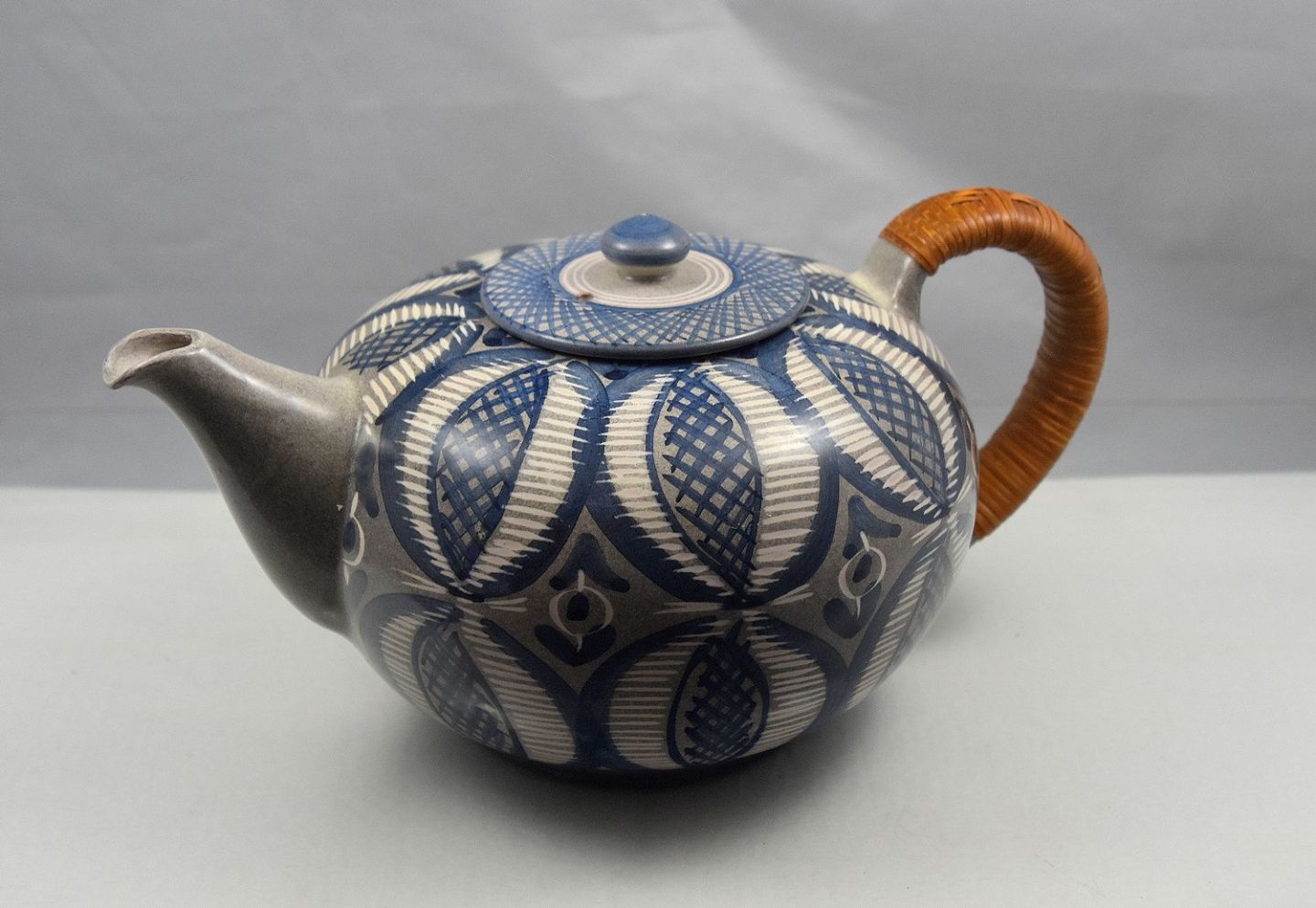 Karen Margrethe Karberg tekande i blå farvet mønster flettet hank.