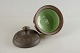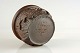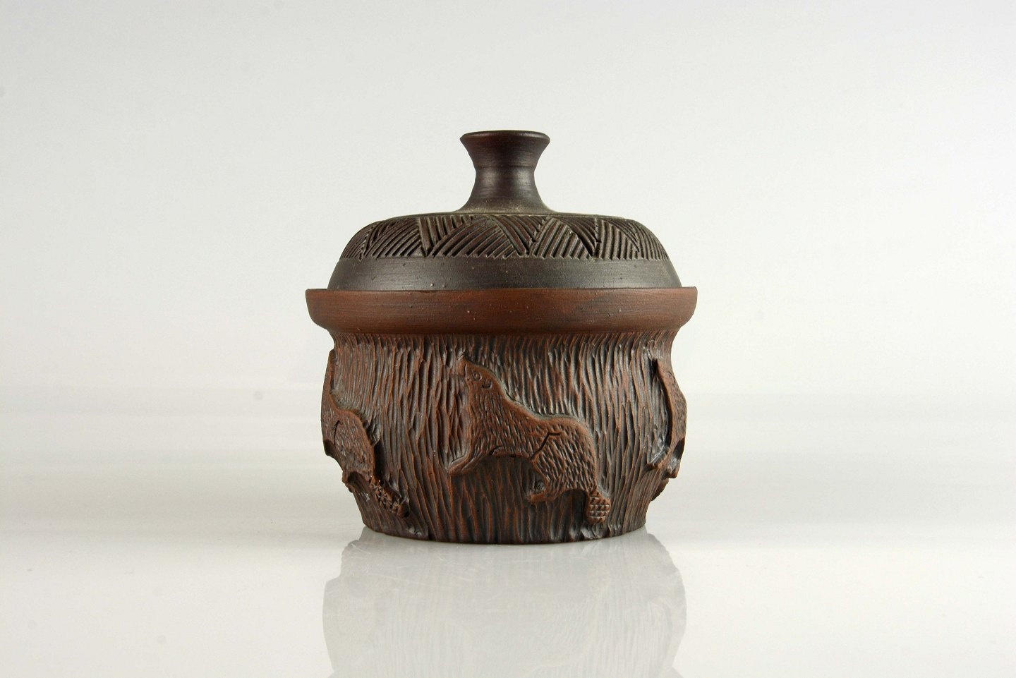 Lågkrukke med udskåret dyremotiv og indvendig grøn glasur. Intakt.