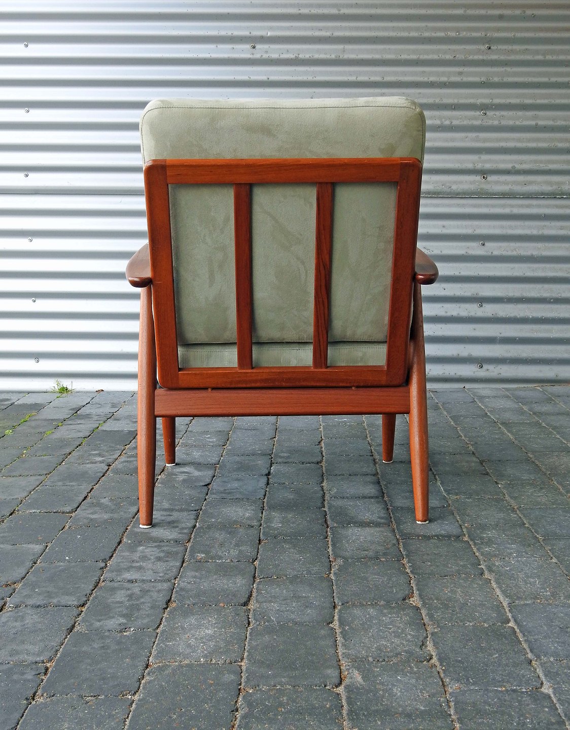 Lænestol i teaktræ med polstret sæde med gråt stofbetræk, betræk og polstring i god stand.
