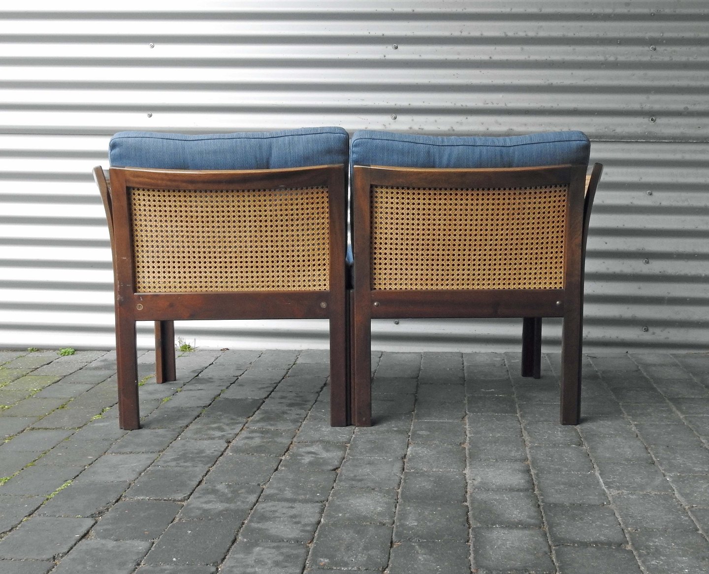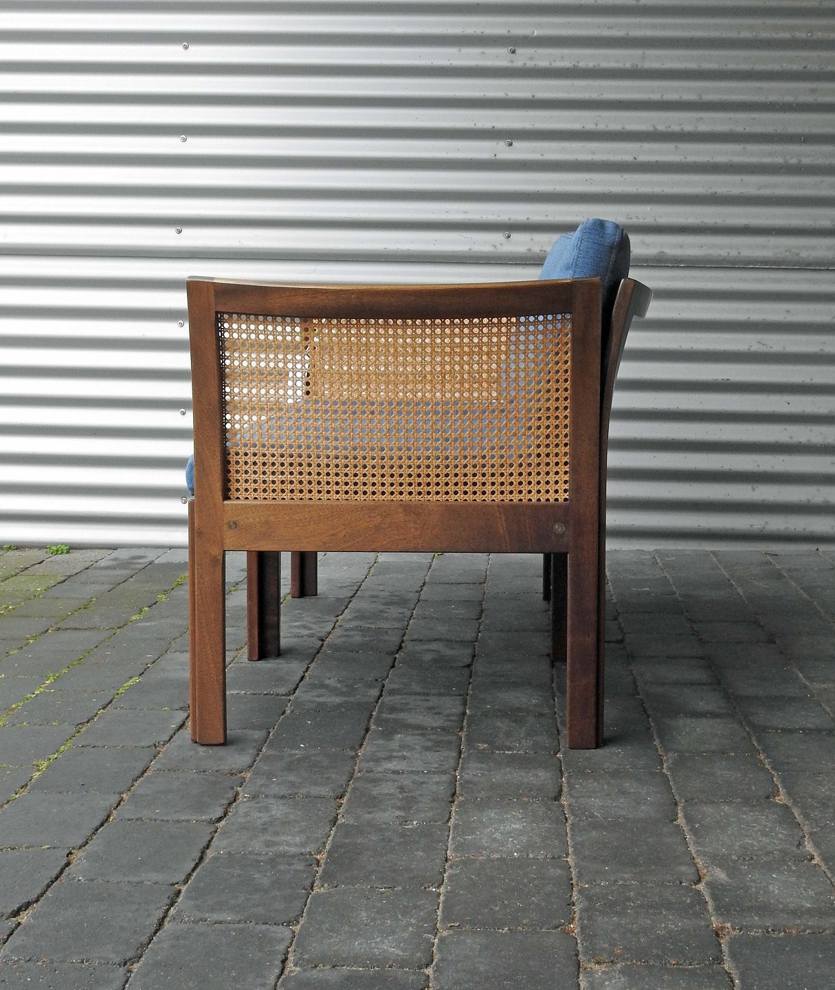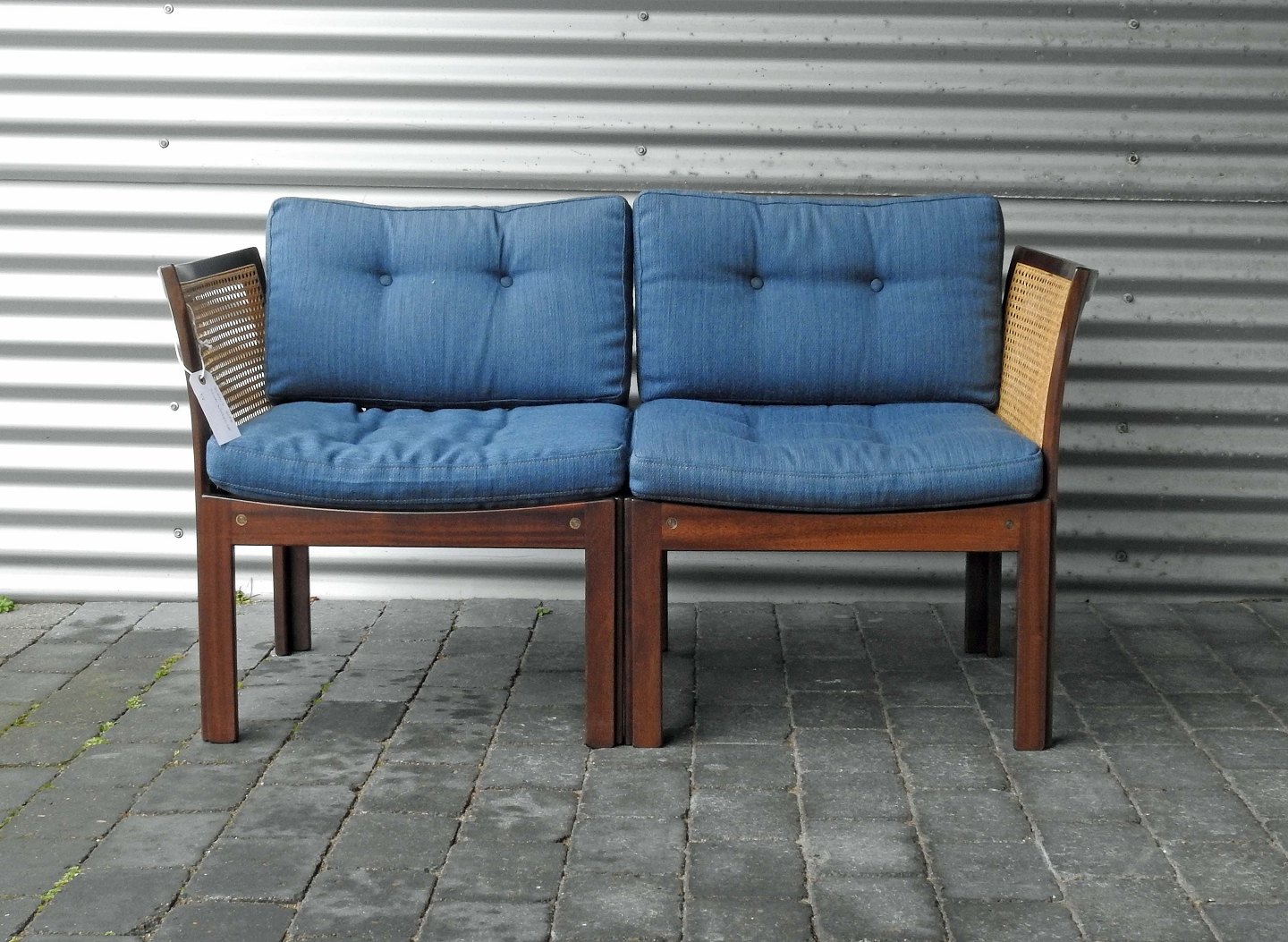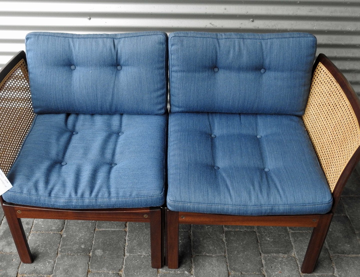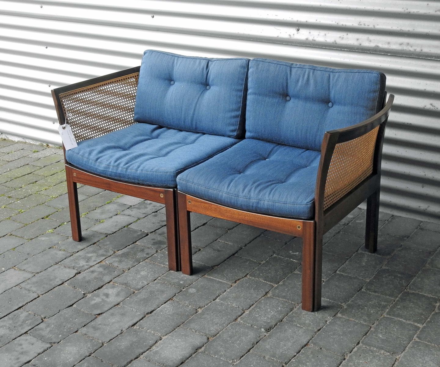 2 personers Plexus sofa med blåt stofbetrukket sæde og ryglæn