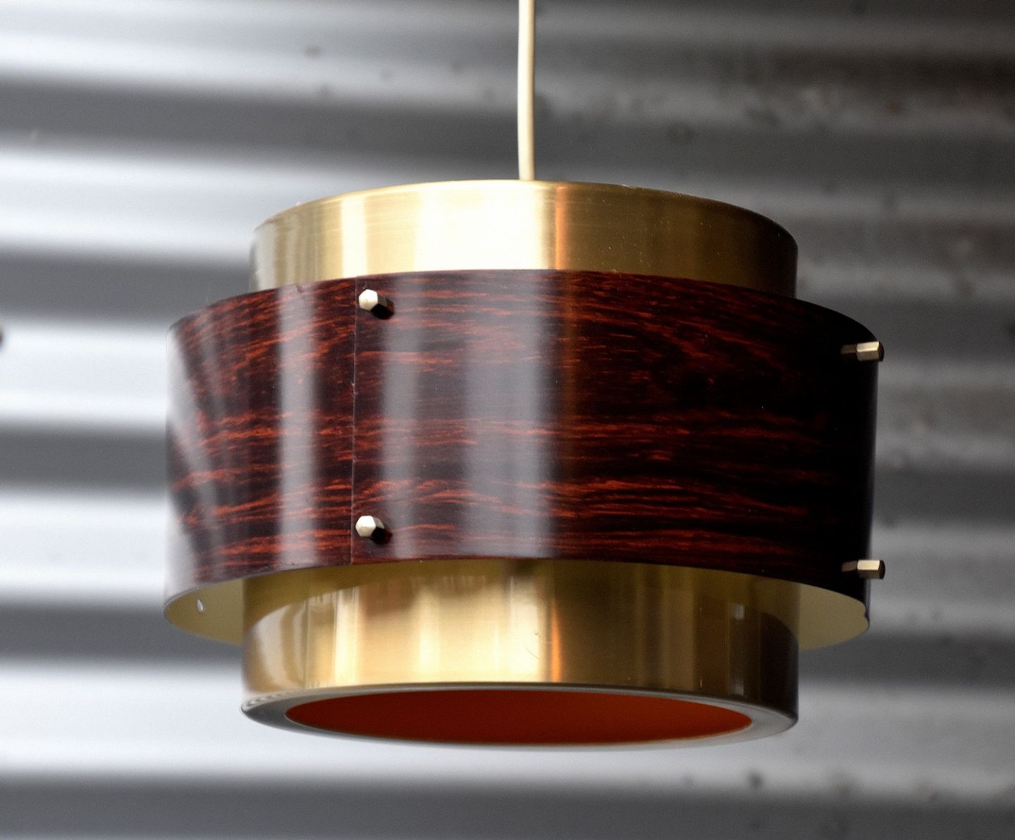 Pendel i metal med brunt plast yderst og orangemalet indvendig
