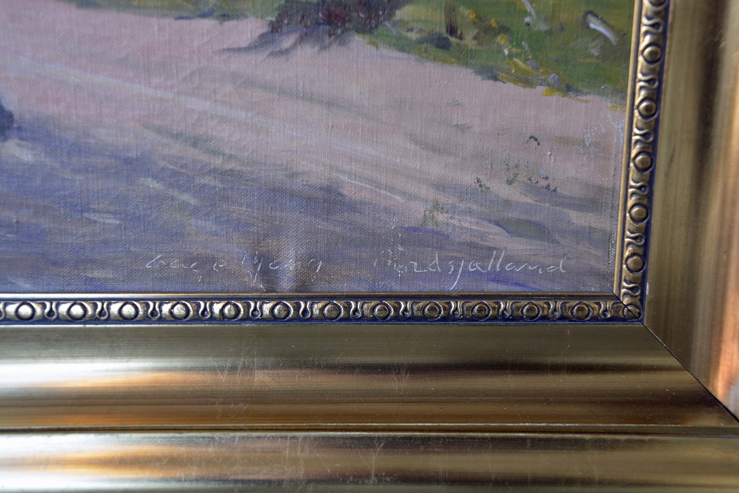 Landskabsmaleri med motiv af siddende bonde med hvilende køer af Aage Vang (alias for Mark Osman Curtis)