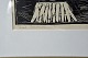 Indrammet træsnit i sølvmalet træramme med abstrakt motiv af fiskekasser. Motivet er formentlig fra Frederikshavn.
