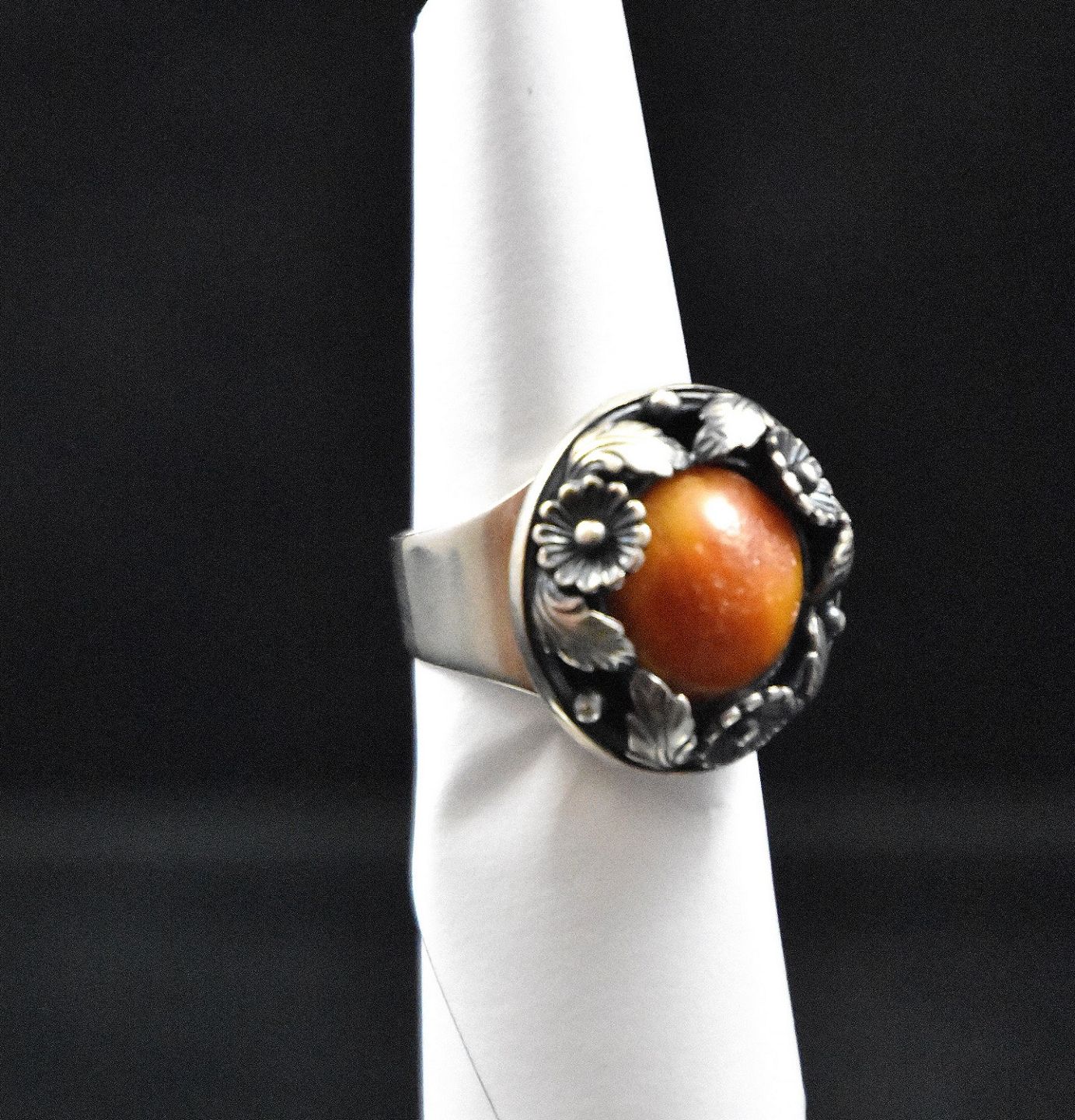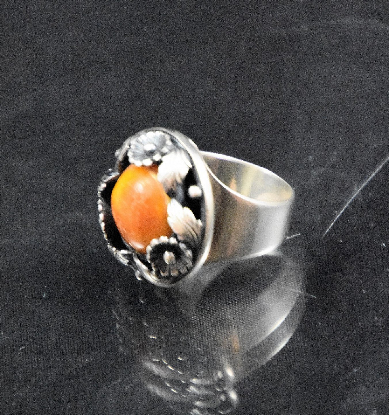 Sølvring (925s) med ravsten, dekoreret med en krans af blomster