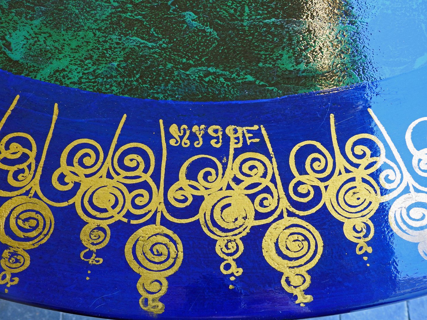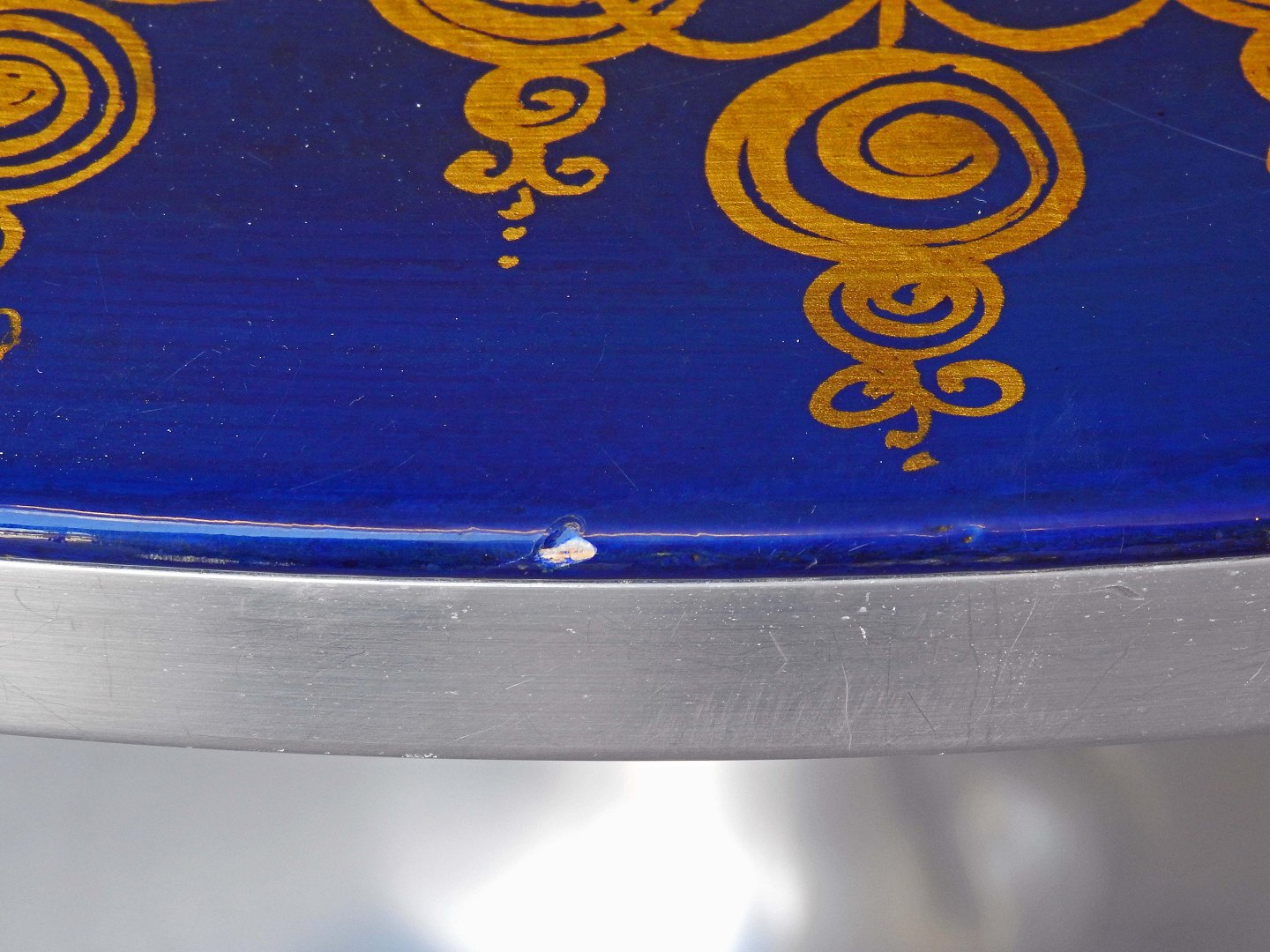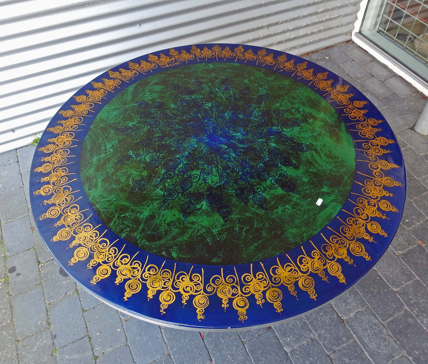 Rundt bord med mønstret bordplade i gylden, blå og grønne nuancer