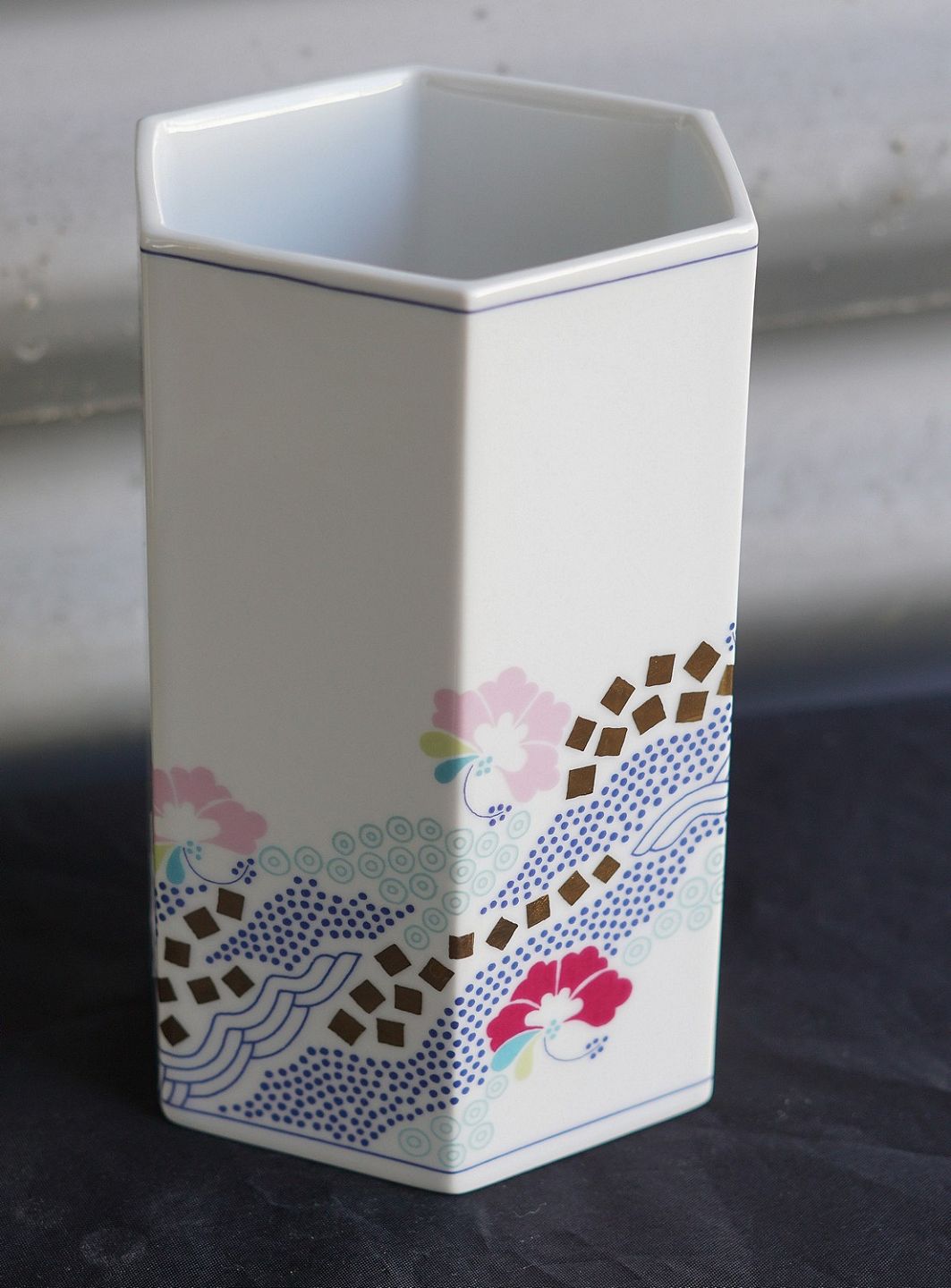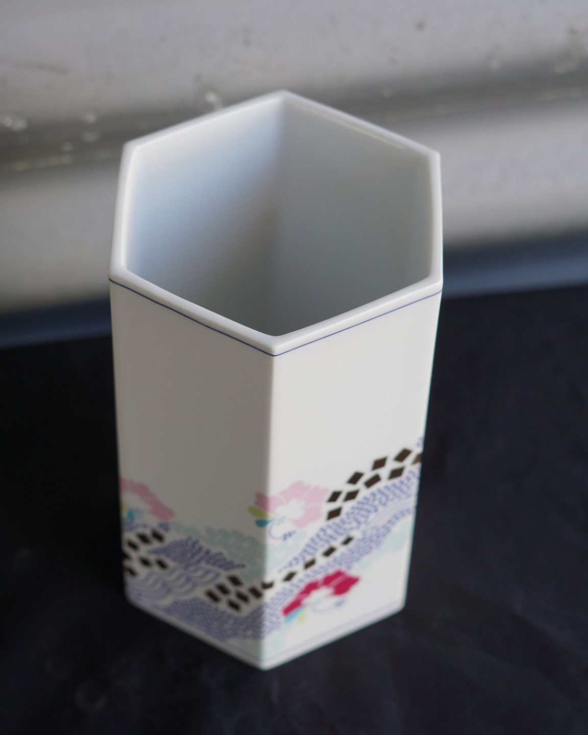 6-kantet vase (1827/5472). Porcelæn dekoreret med trykt motiv og guld