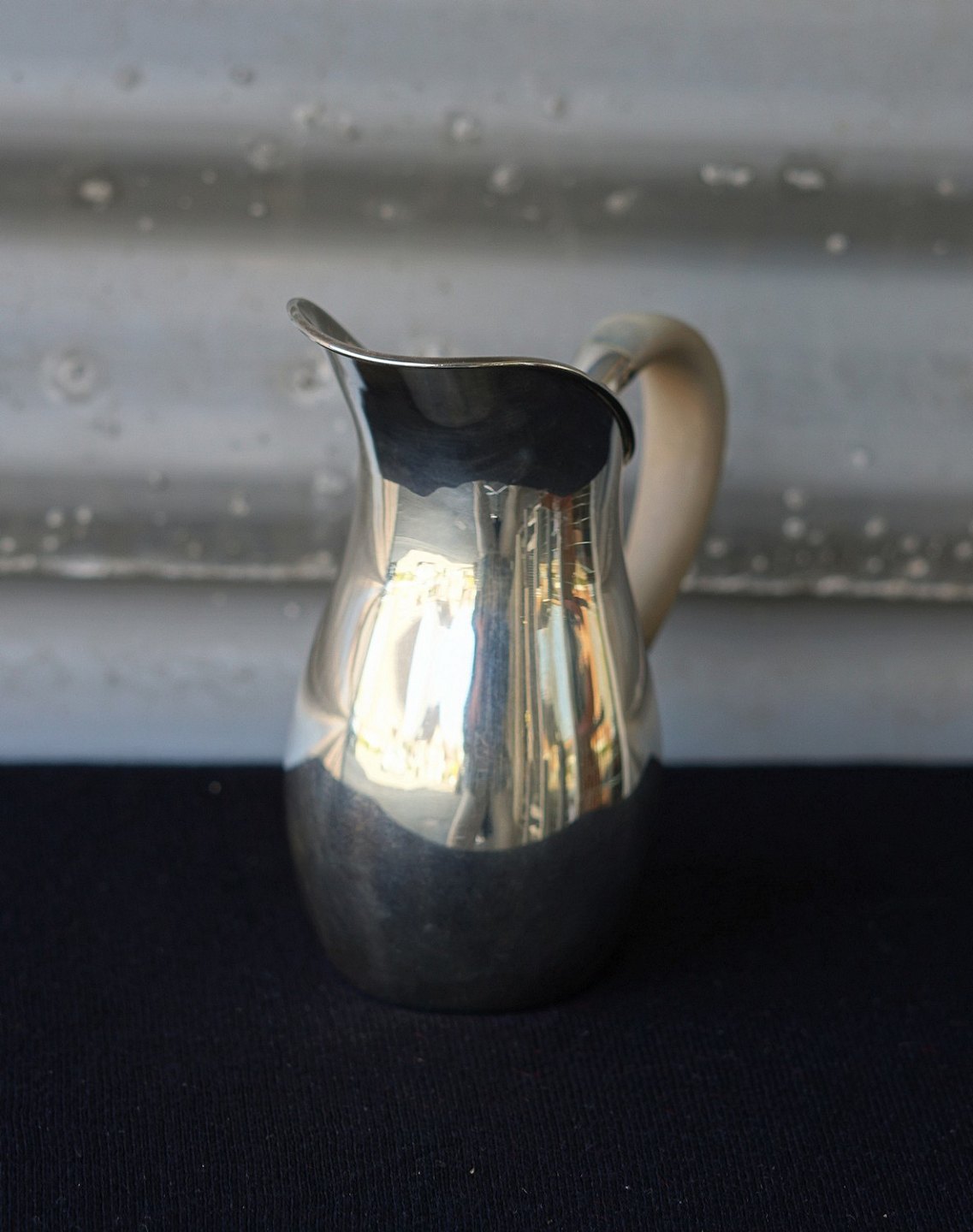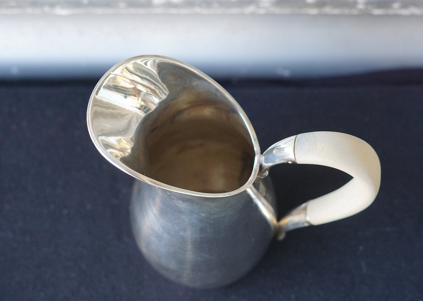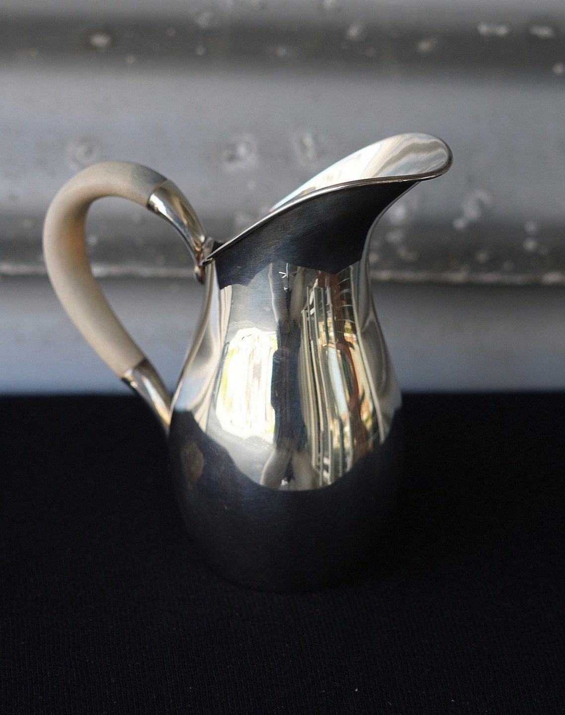 Flødekande med lys hank, lavet på Christian Jensen Sølvvarefabrik, flødekanden er fra 1959