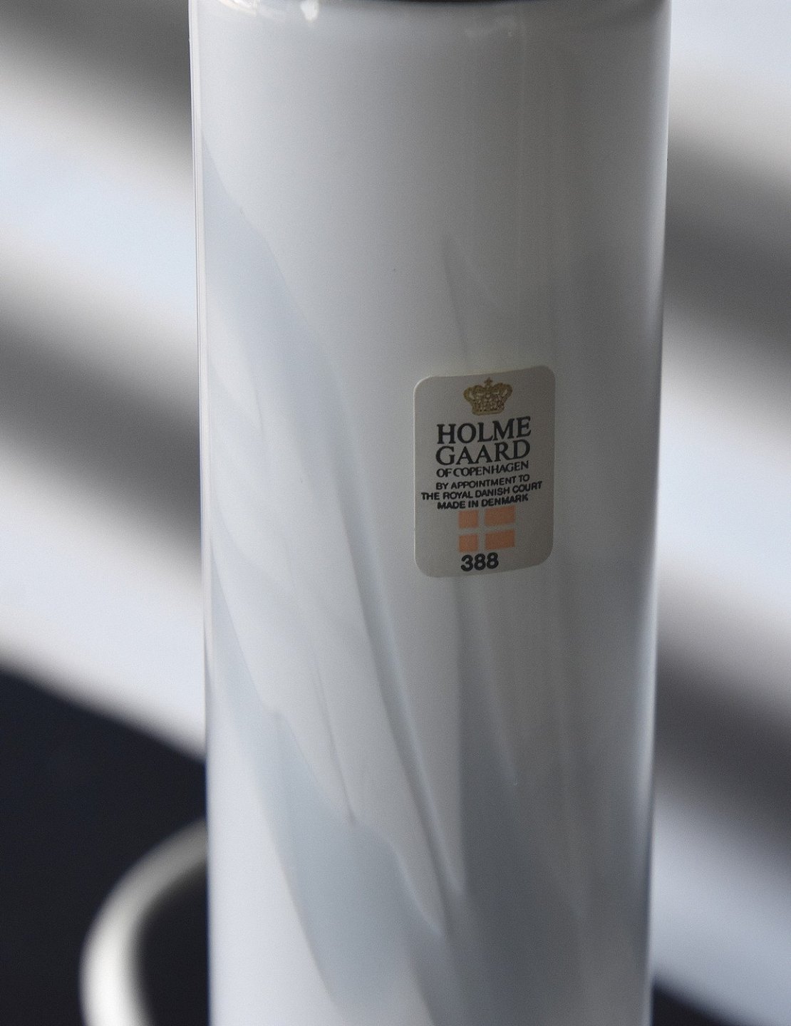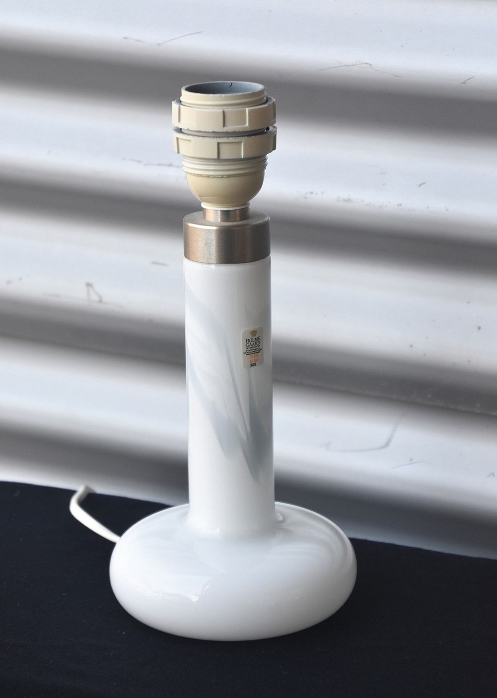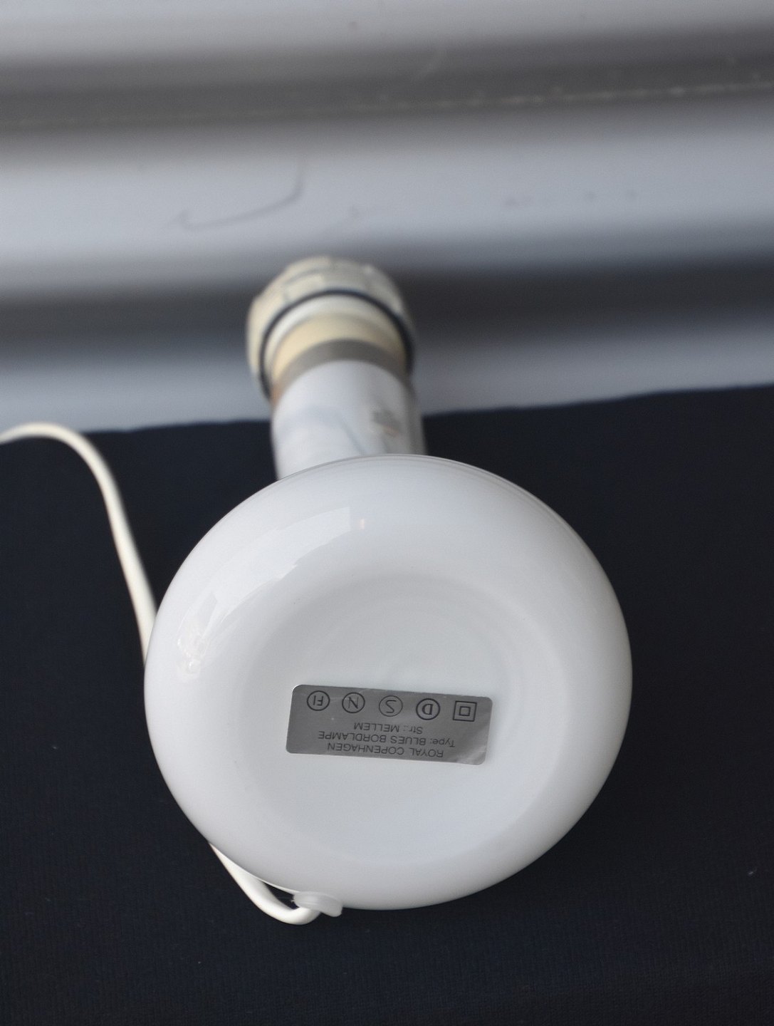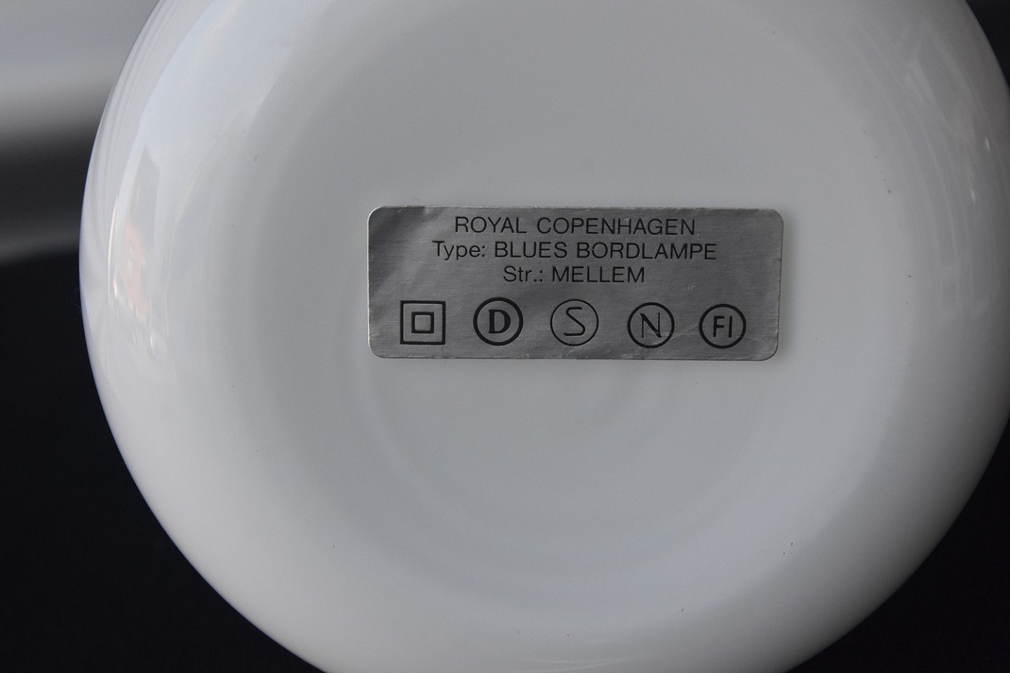 Lampen er lavet i hvidt opalineglas med et svagt blåt, bølget mønster