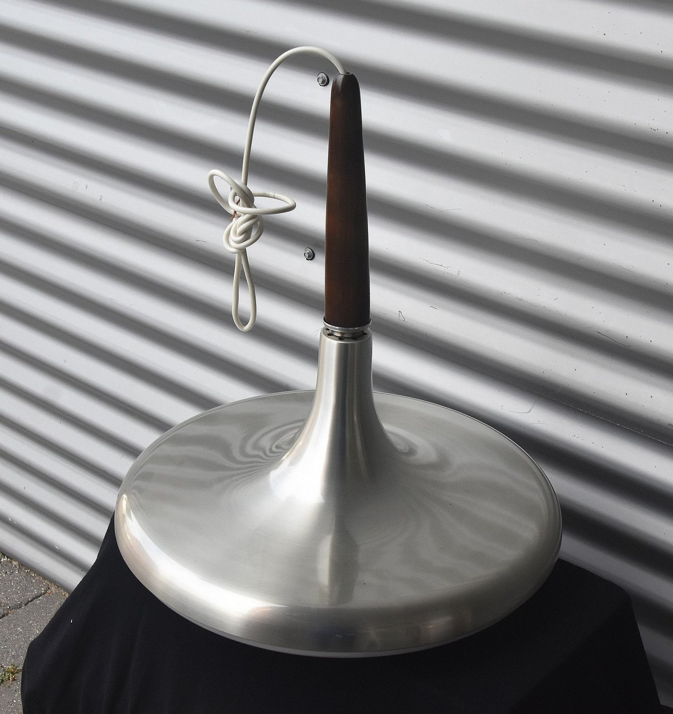 Pendel i poleret metal og palisander. Der er sat en plast lysdæmper i nederste kant, denne lysdæmper er sat fast med en knop af palisander
