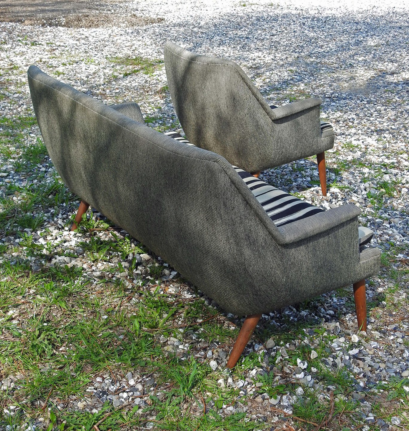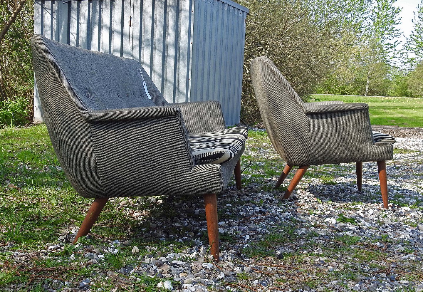 Møbelsættet er med originalt stofbetræk i uld med mønstret hynder i sort, hvid grå på gråmeleret møbel med ben i mørk olieret egetræ
