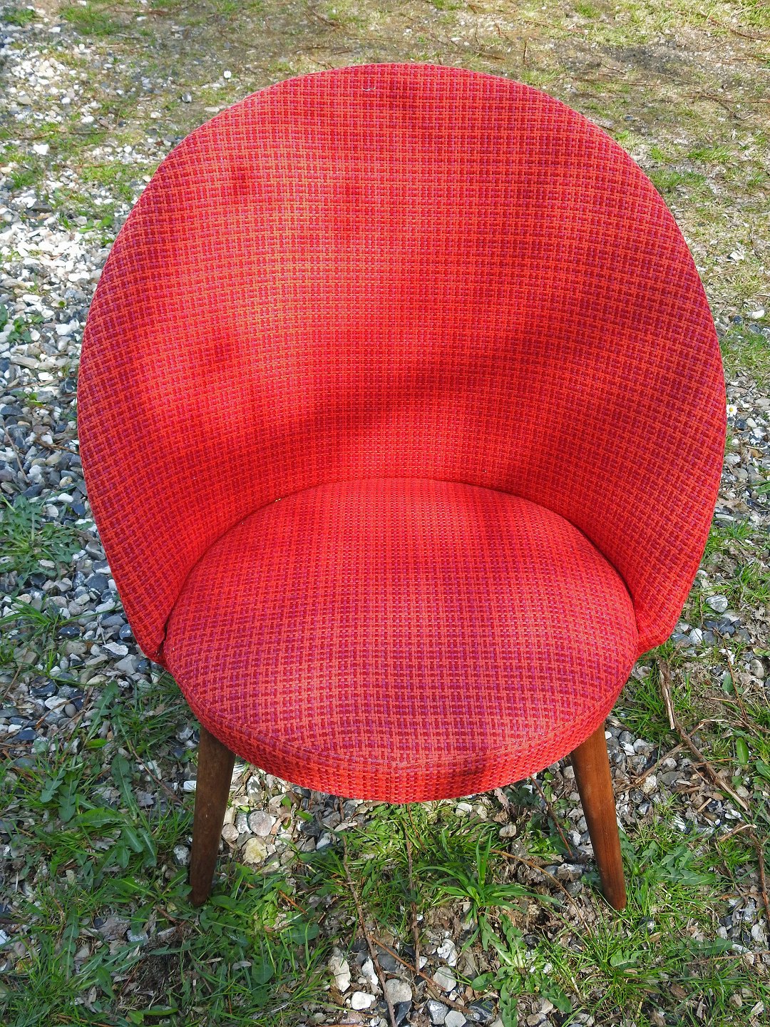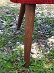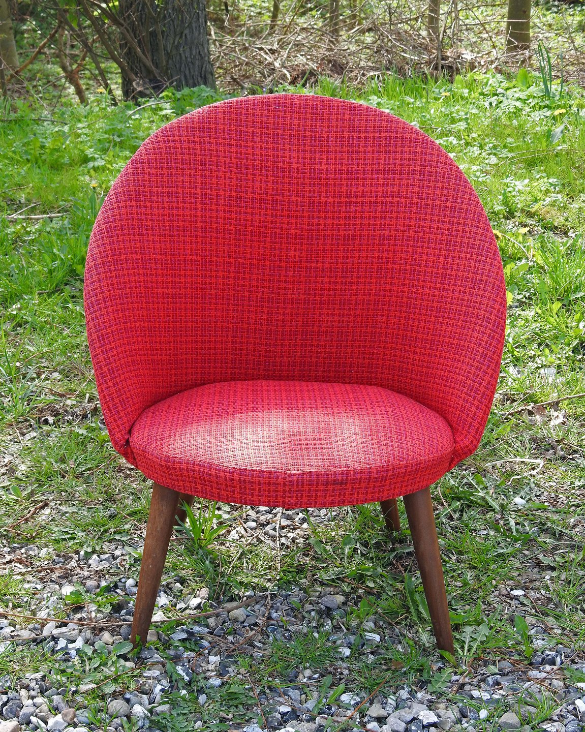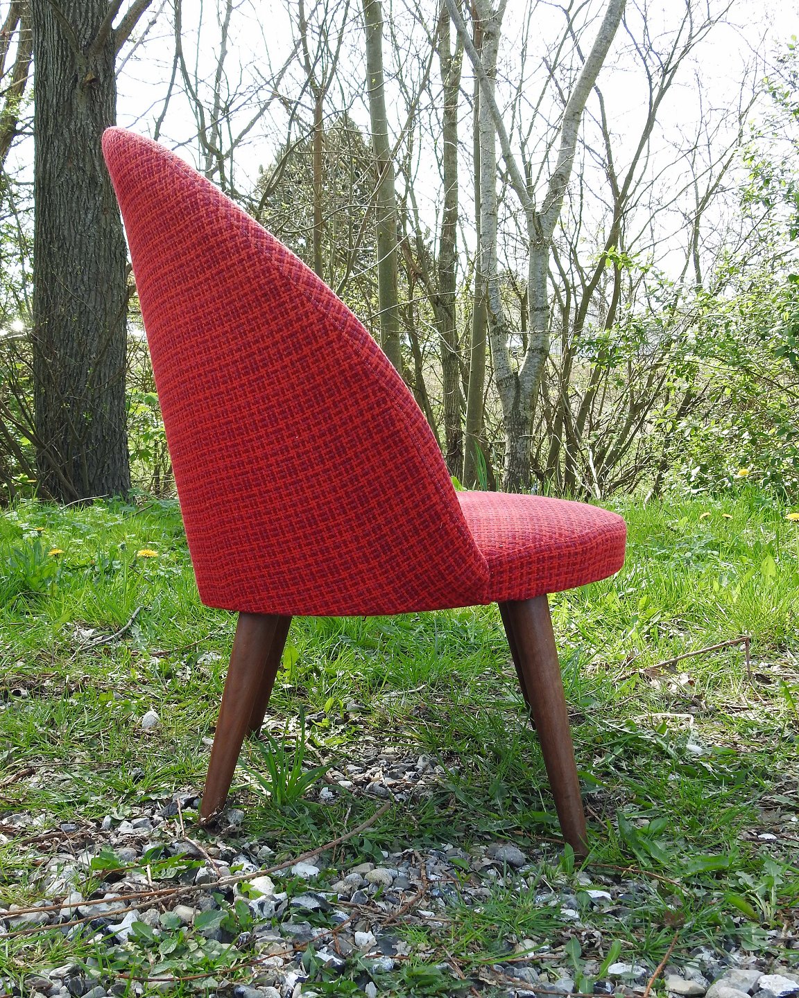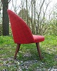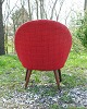 Lænestol - grydestol fra 1950'erne med ben i tilspidset teaktræ samt rød og pink meleret stofbetræk