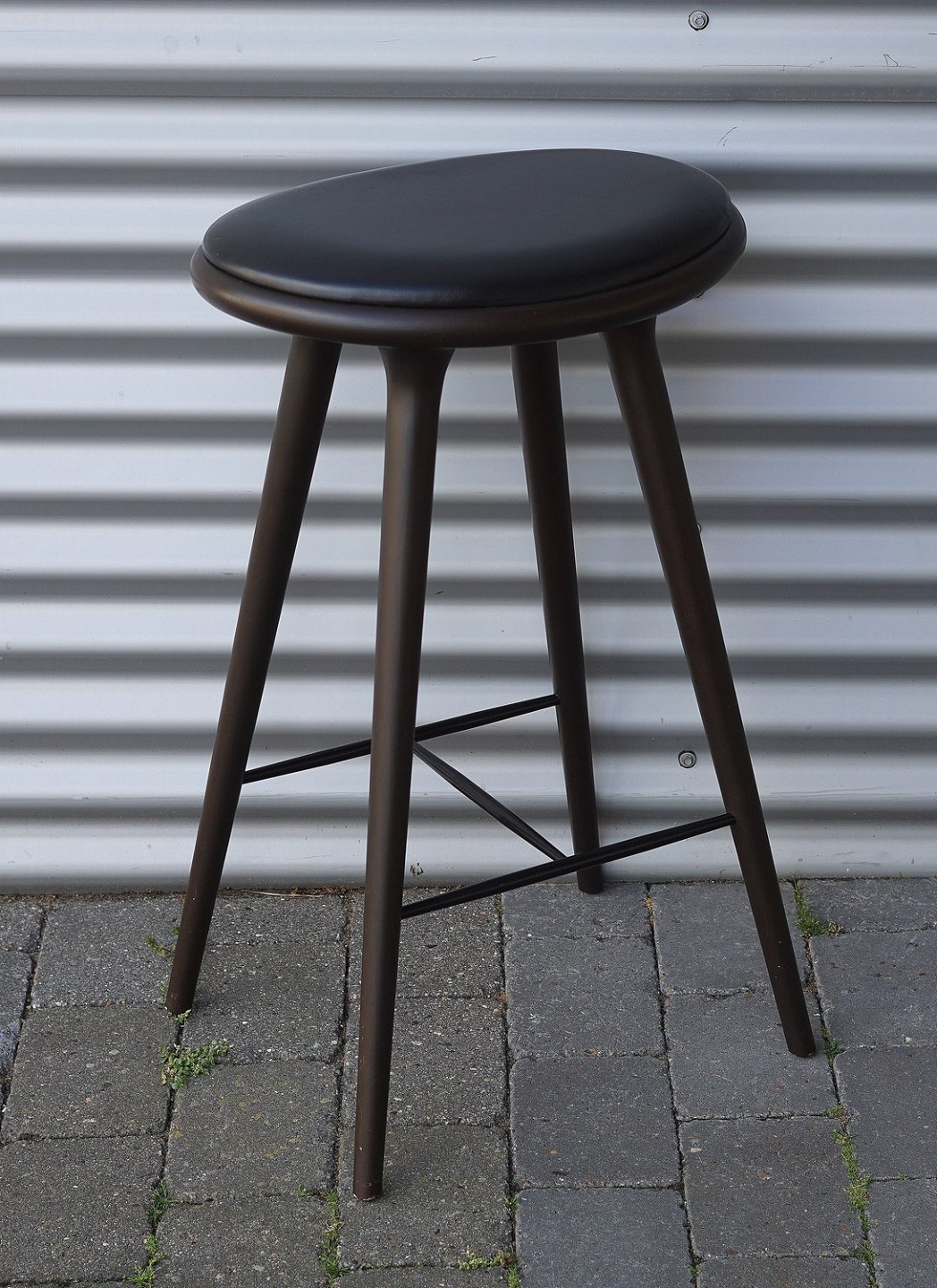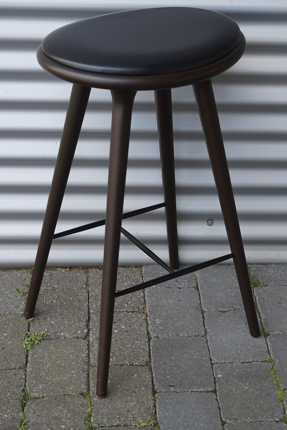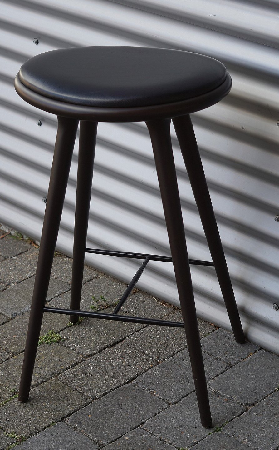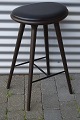 Barstol, lavet i bejdset bøgetræ. Stolesædet er af læder