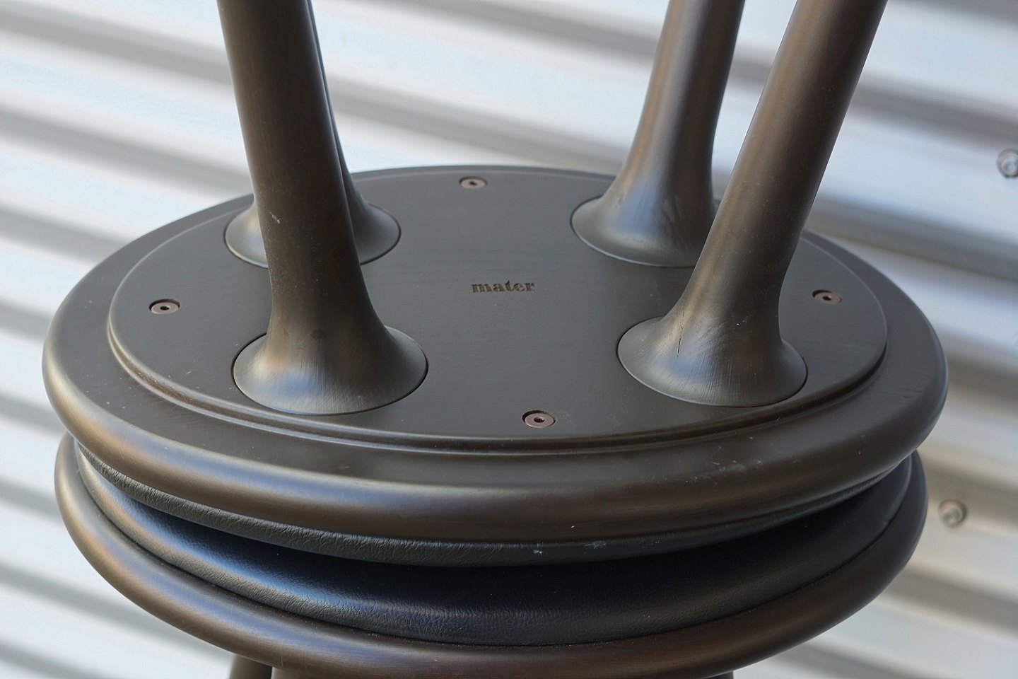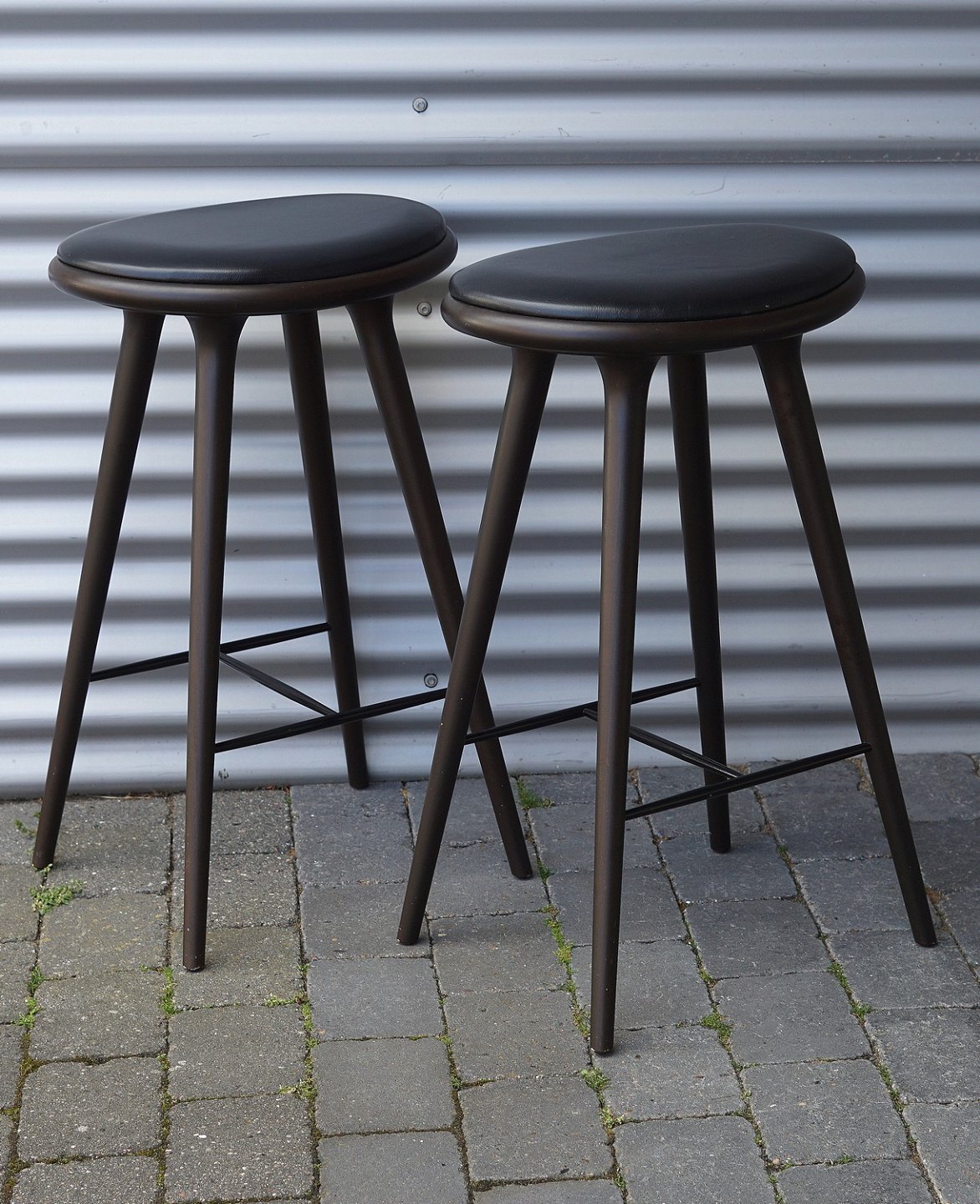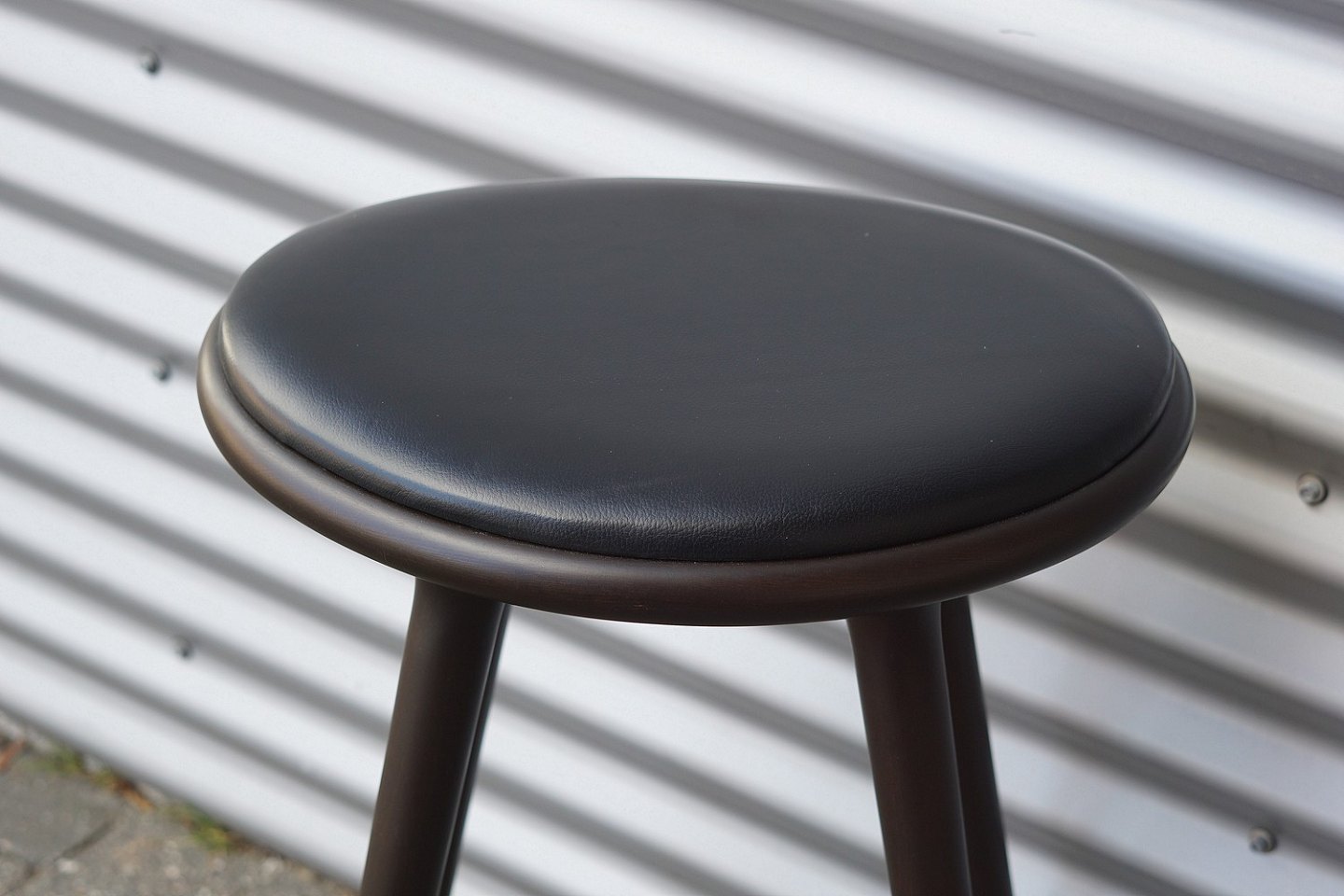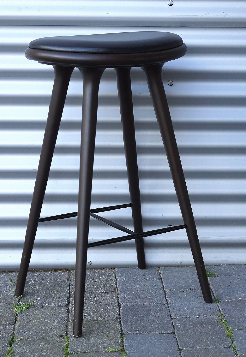Barstol, lavet i bejdset bøgetræ. Stolesædet er af læder