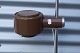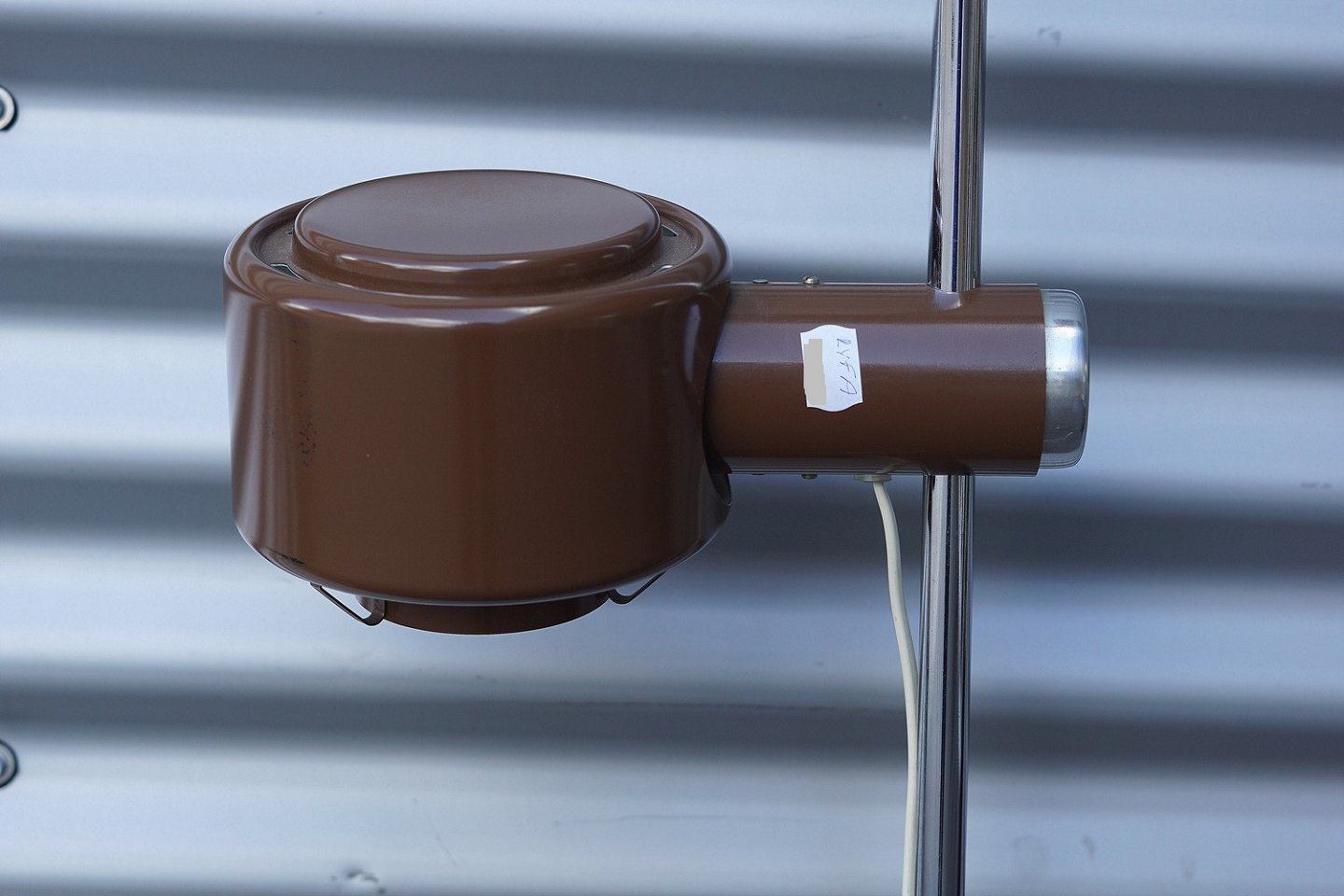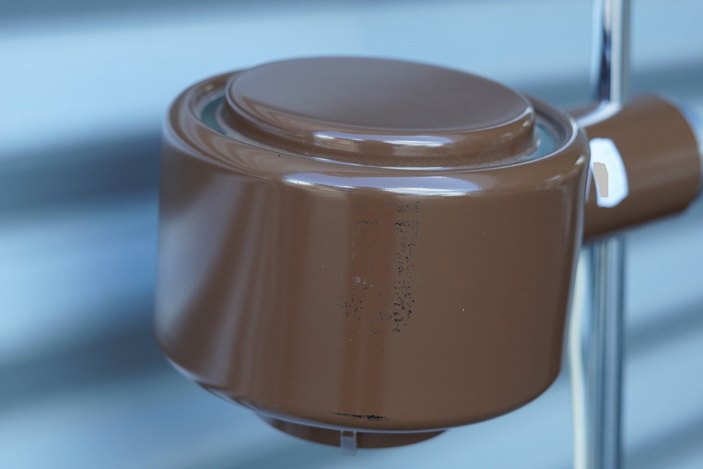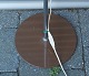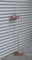 Lyfa standerlampe med rund metalskærm, der er brunlakkeret.