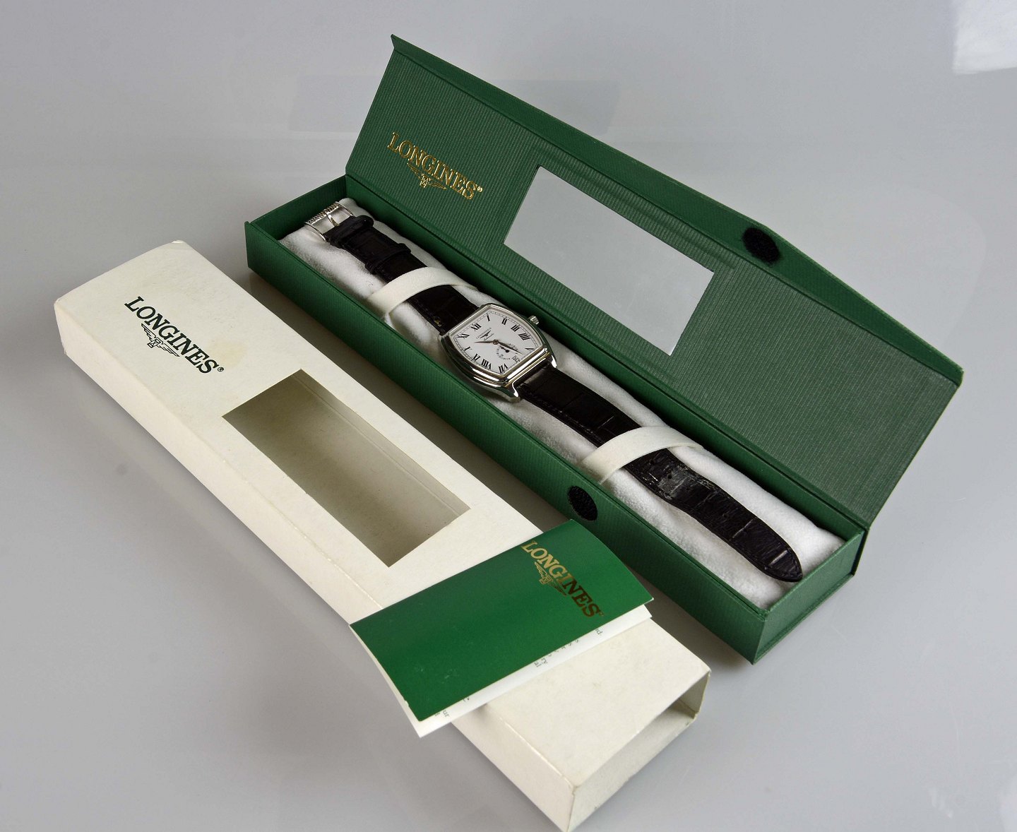 Armbåndsur med sort læderrem i original emballage fra Longines
