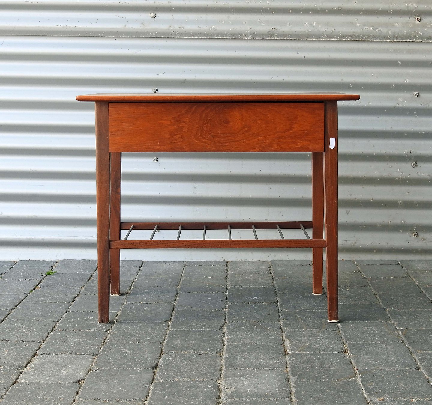 Sybord i teaktræ med tremmehylde og indsatskuffe