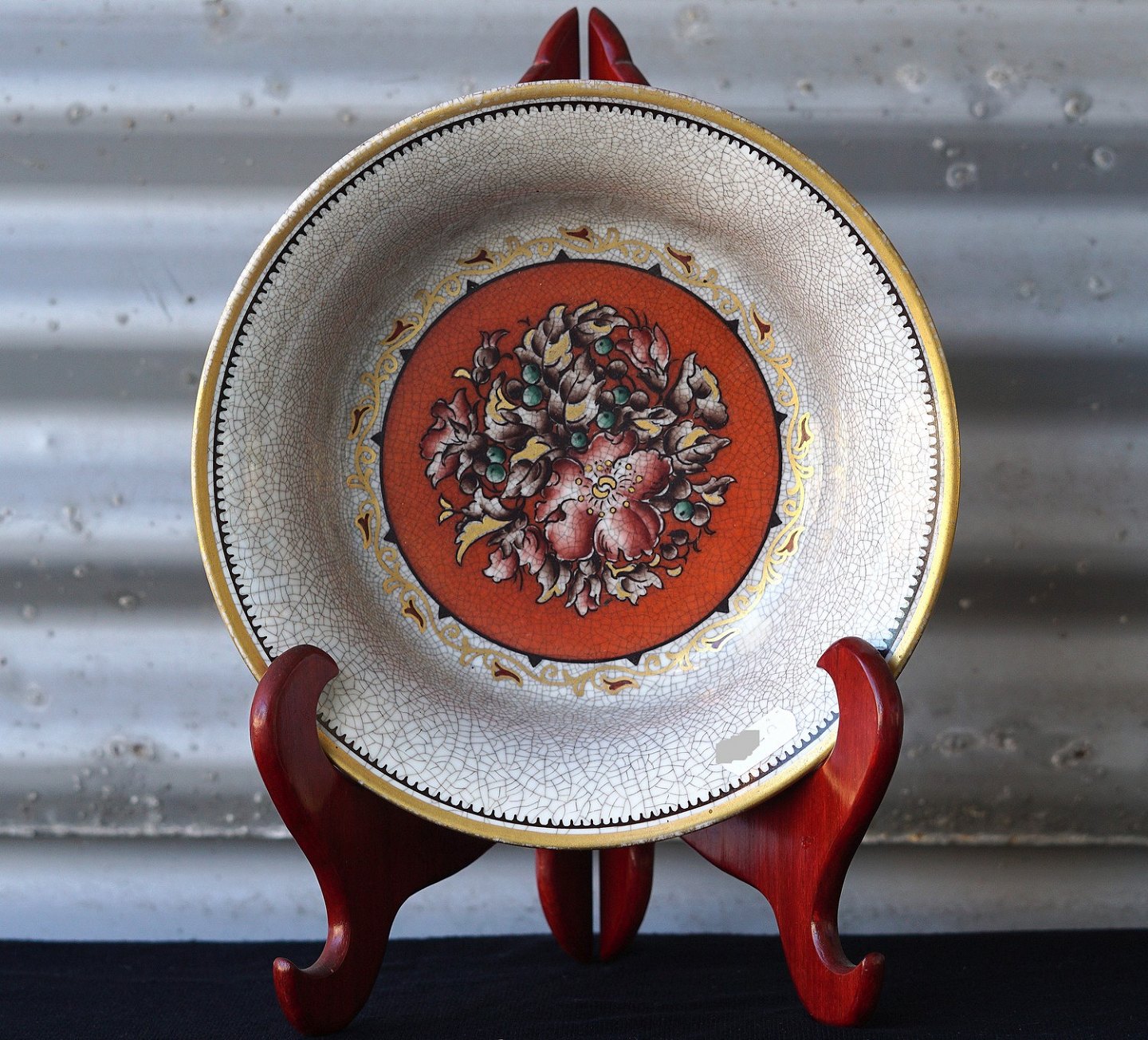 Krakelé porcelæns skål nr 129/490 med typisk bemaling fra Dahl Jensen, med hvide grålige og mørkerøde farver og guld kanter