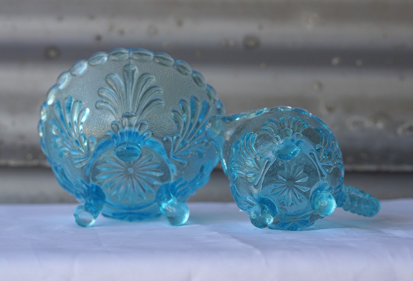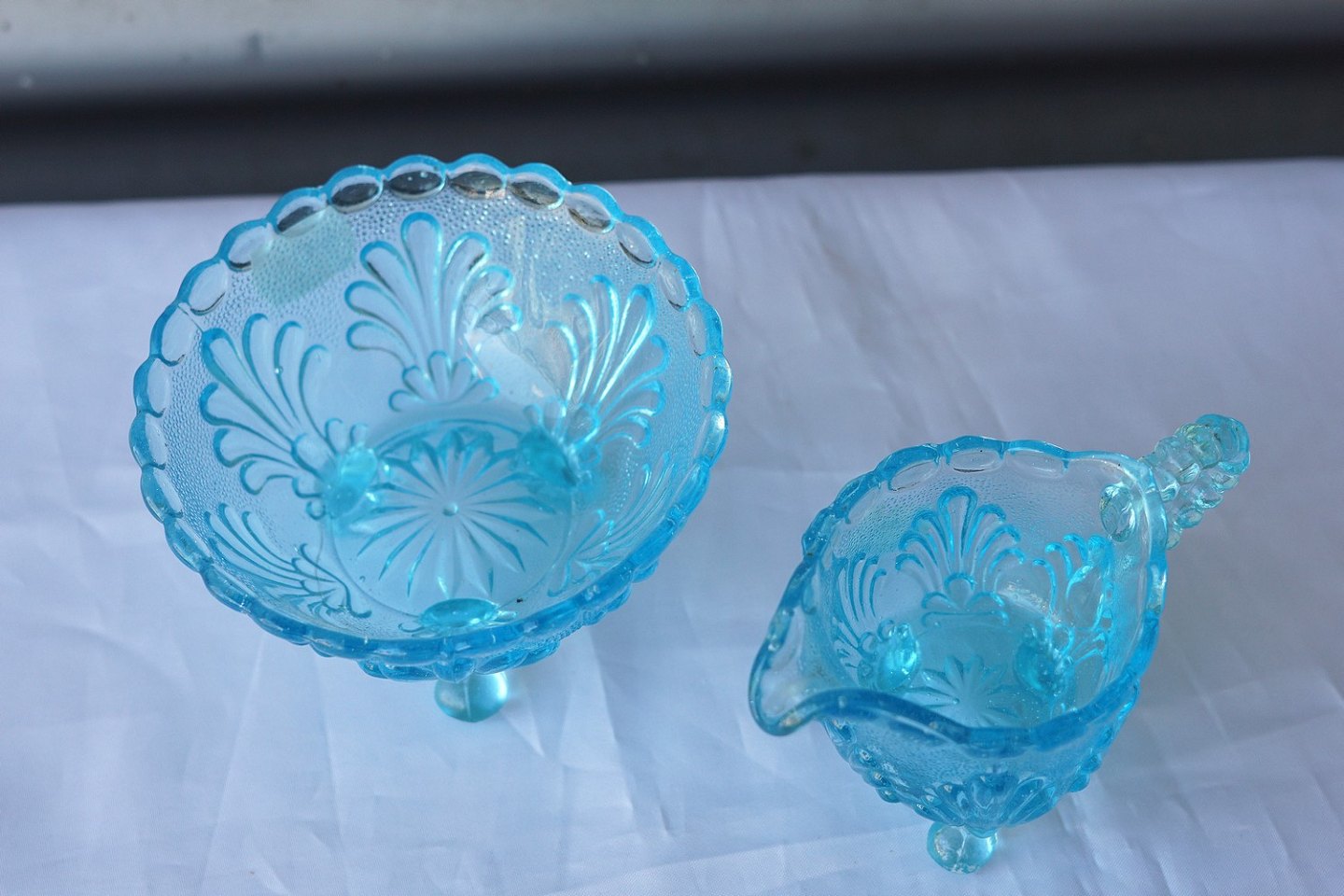 Søblå fløde- og sukkersæt i presset glas