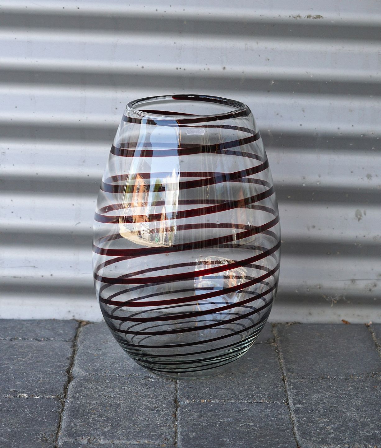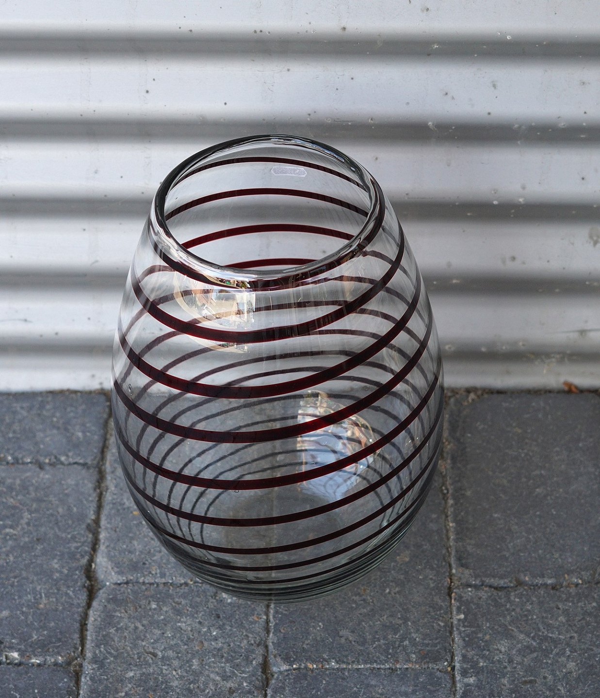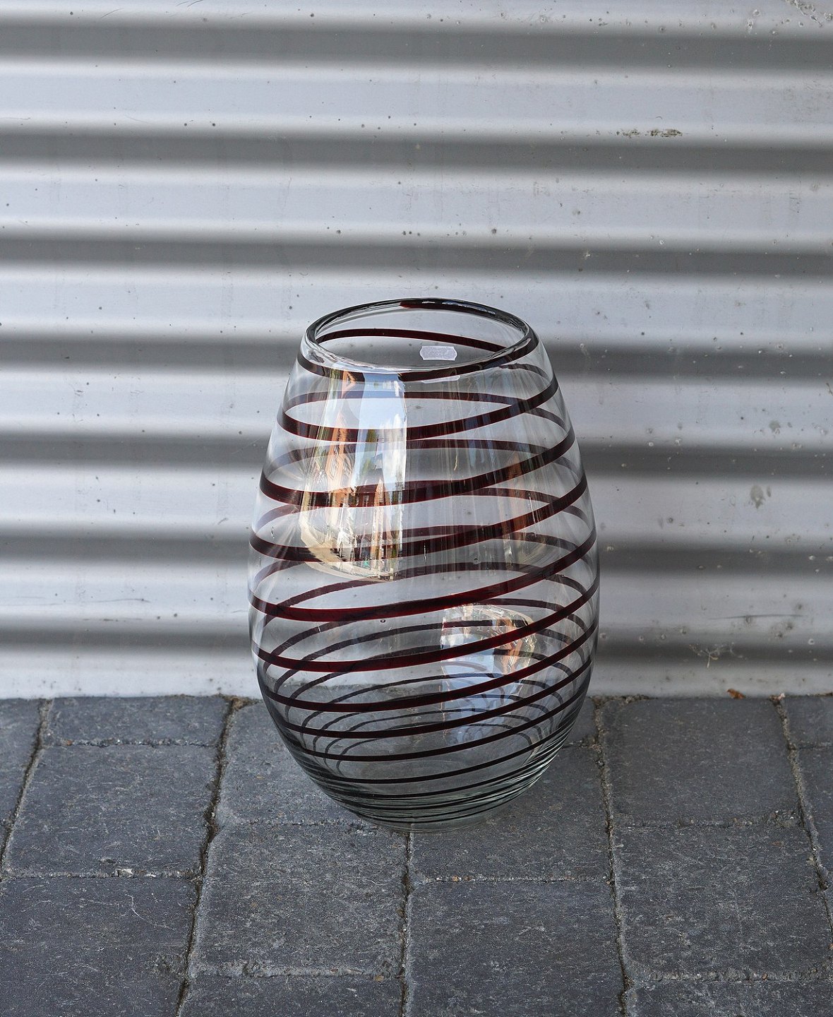 Stor glas gulvvase med højde af 35 cm, klar glas med lilla snoet spiral.