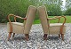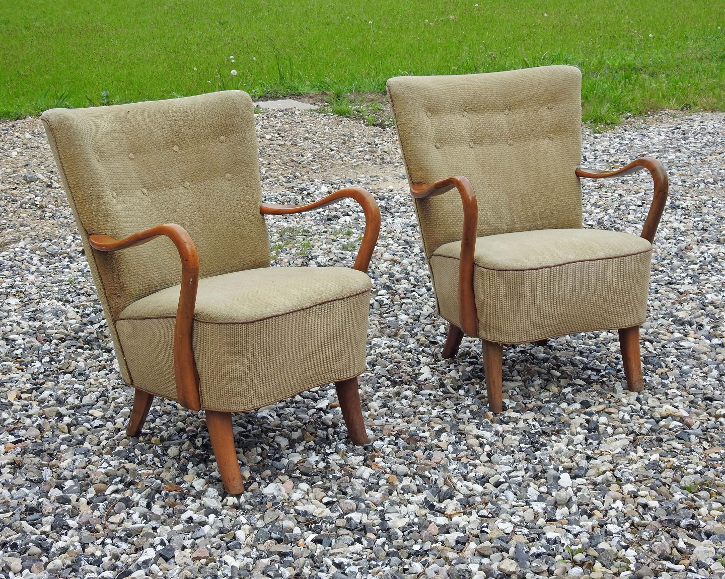 Et sæt lænestole i bejdset bøgetræ med svungne armlæn og polstret af Alfred Christensen