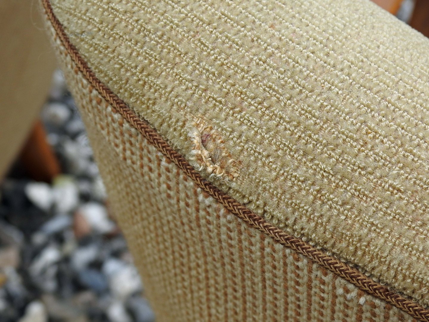 Fremstår med brugsspor på stel, lettere slid på stof i kant af ryglæn mindre hul i stoffet på den ene stol