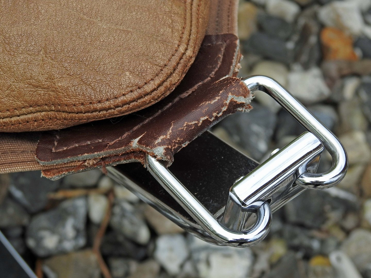 Fremstår med patineret læderhynder med to manglende knapper samt mindre hul i et sæde samt brugsspor på skammel