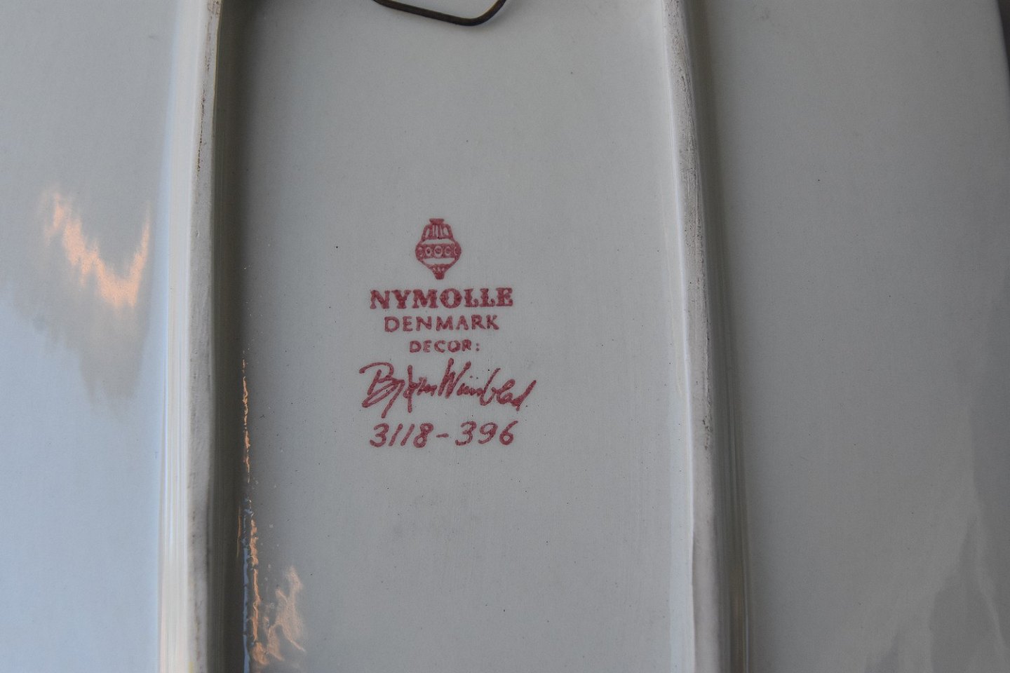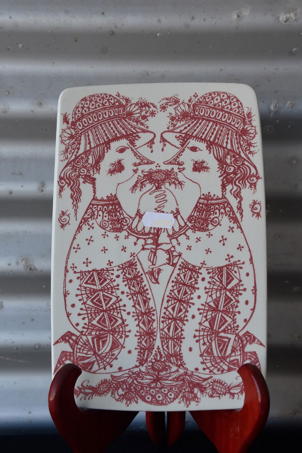 Aflang platte nr. 3118-396. Dekor er med rød streg, to damer med blomst.